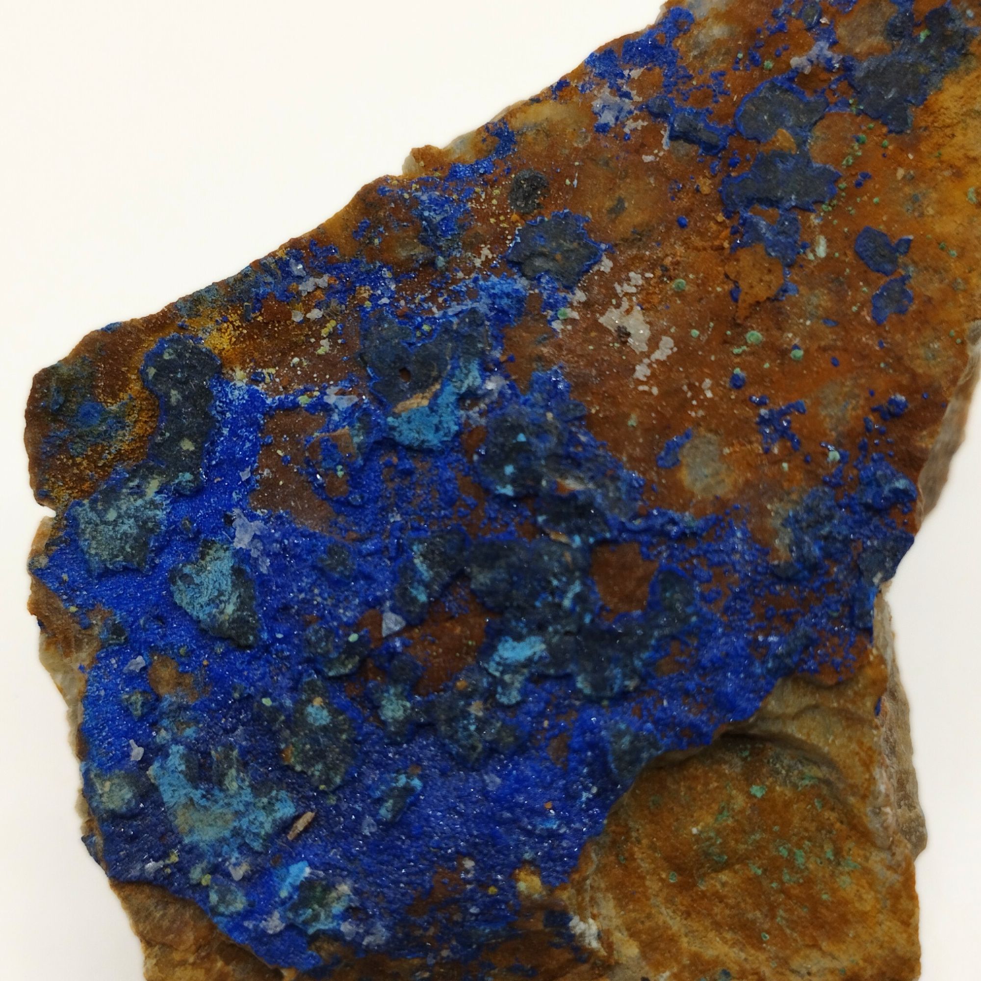 - L’azurite est souvent trouvée en association avec la malachite, un autre carbonate de cuivre. Avec le temps, l’azurite peut se transformer en malachite par un processus d’hydratation et de réarrangement moléculaire, ce qui est souvent visible dans les spécimens minéraux où les deux minéraux coexistent, créant de magnifiques contrastes de couleur bleu et vert.