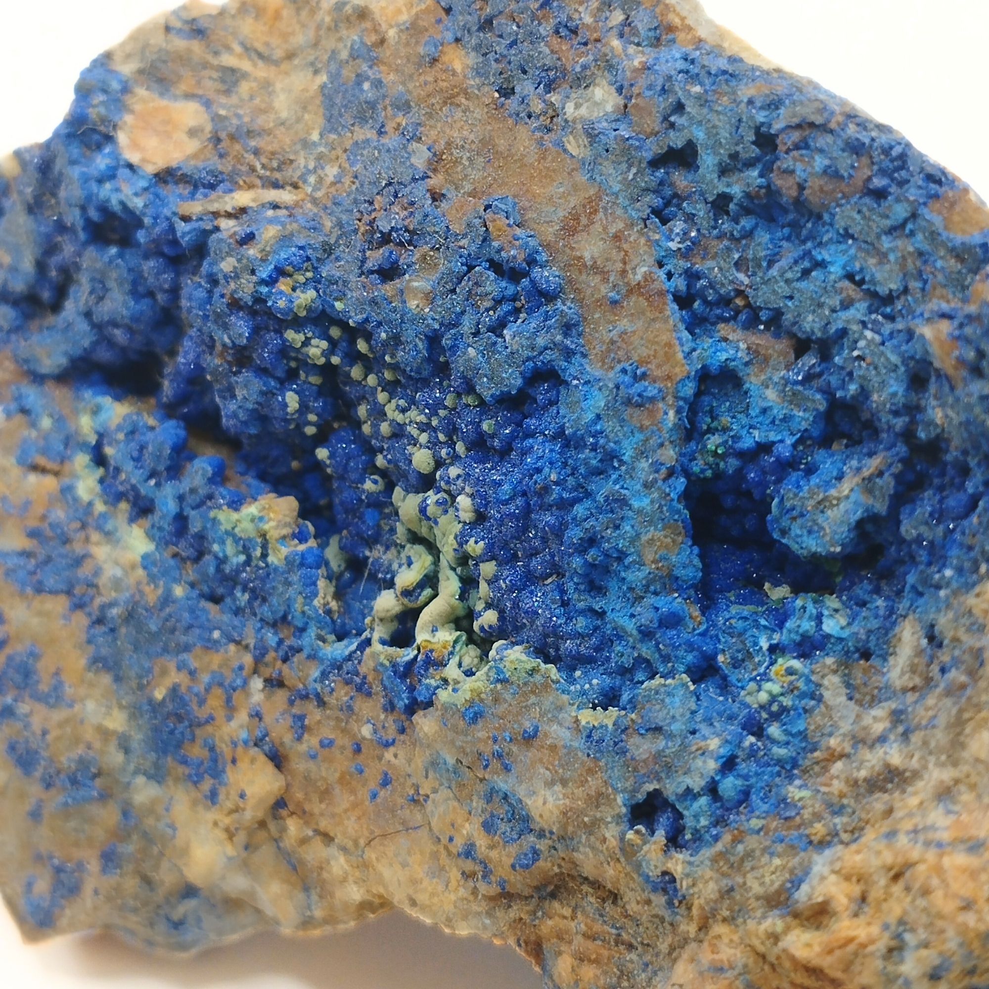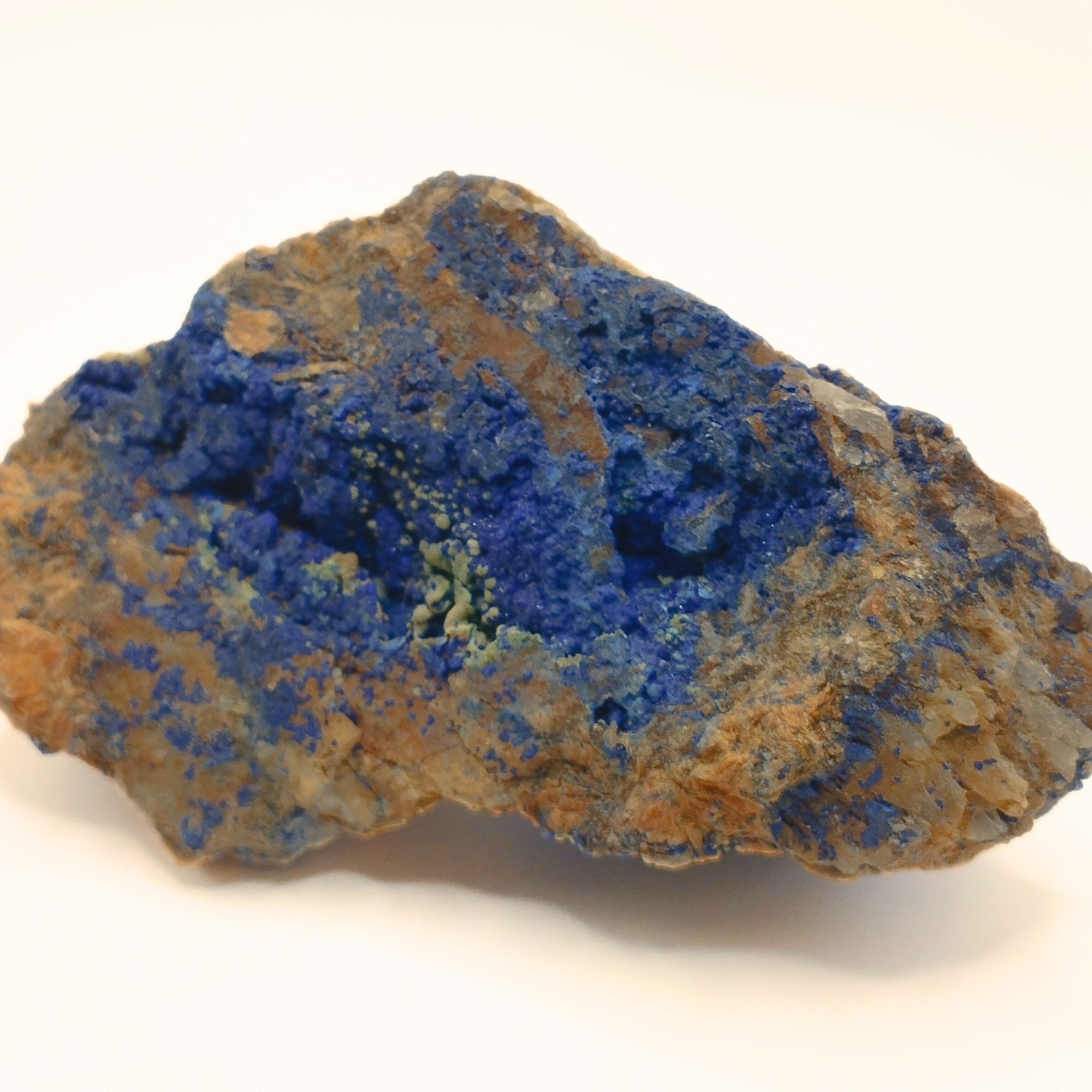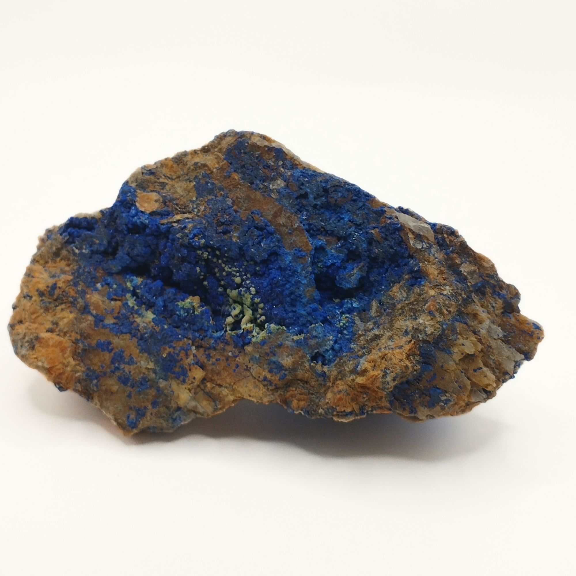 - L’azurite est souvent trouvée en association avec la malachite, un autre carbonate de cuivre. Avec le temps, l’azurite peut se transformer en malachite par un processus d’hydratation et de réarrangement moléculaire, ce qui est souvent visible dans les spécimens minéraux où les deux minéraux coexistent, créant de magnifiques contrastes de couleur bleu et vert.