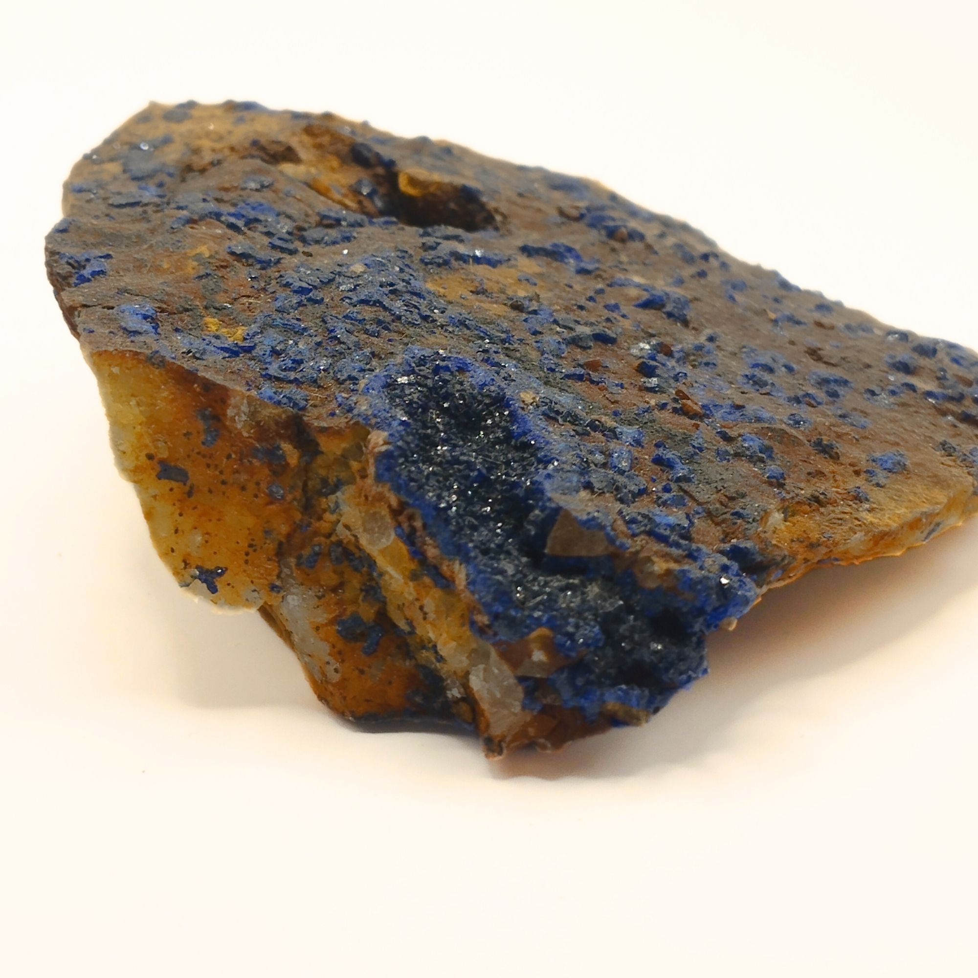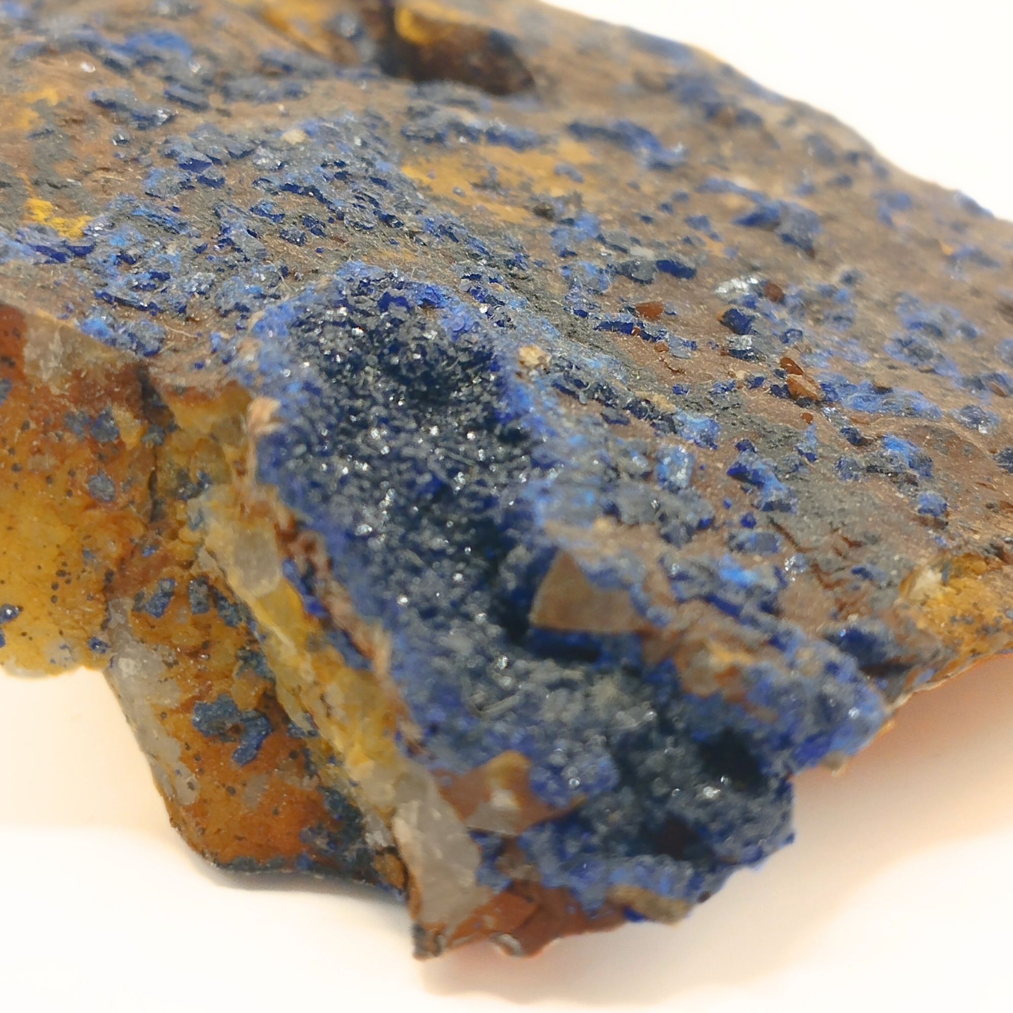 - L’azurite est souvent trouvée en association avec la malachite, un autre carbonate de cuivre. Avec le temps, l’azurite peut se transformer en malachite par un processus d’hydratation et de réarrangement moléculaire, ce qui est souvent visible dans les spécimens minéraux où les deux minéraux coexistent, créant de magnifiques contrastes de couleur bleu et vert.