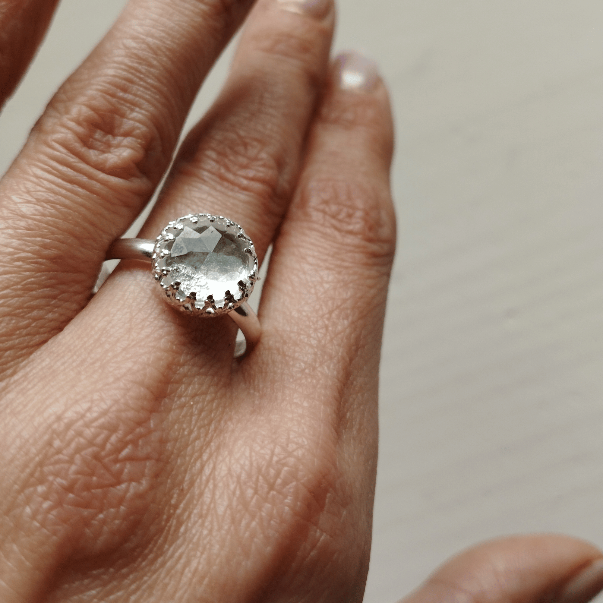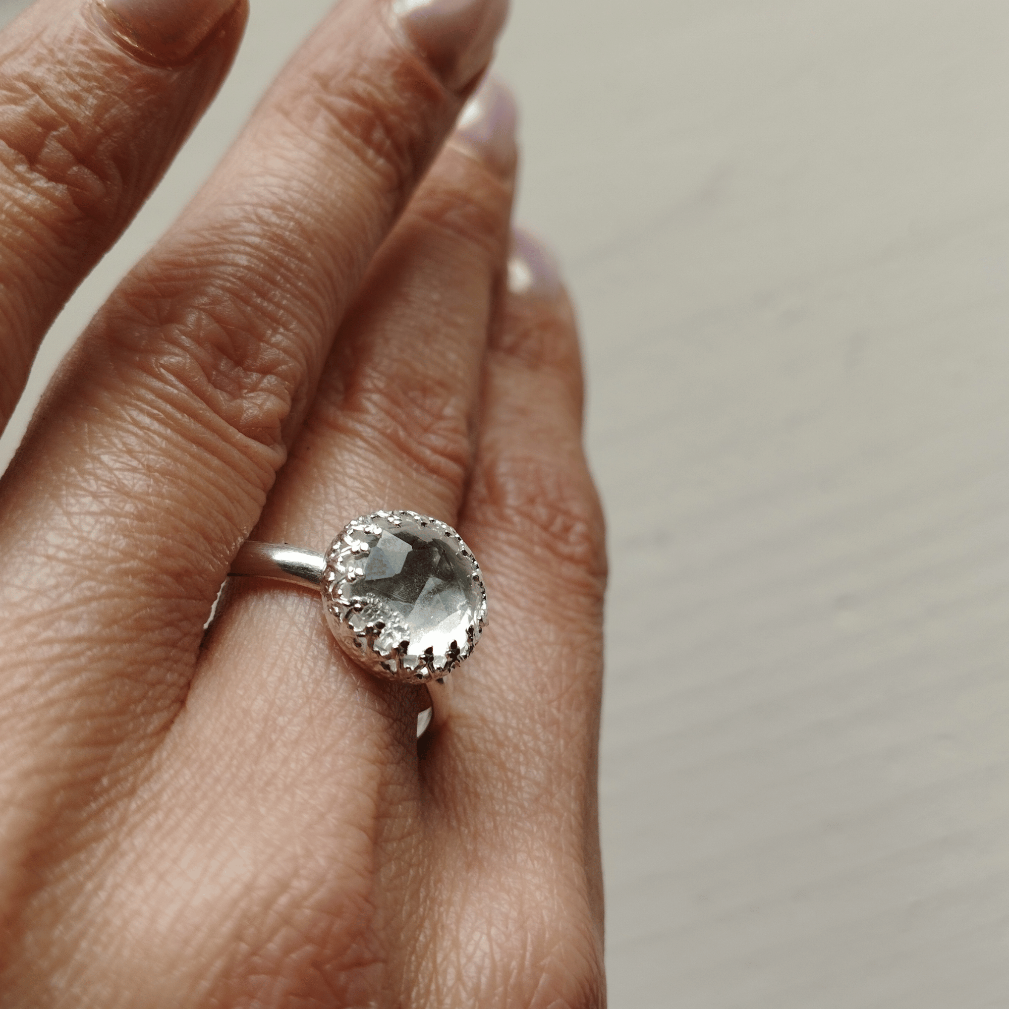 Découvrez une création unique avec cette bague artisanale en cristal de roche et argent sterling 925.