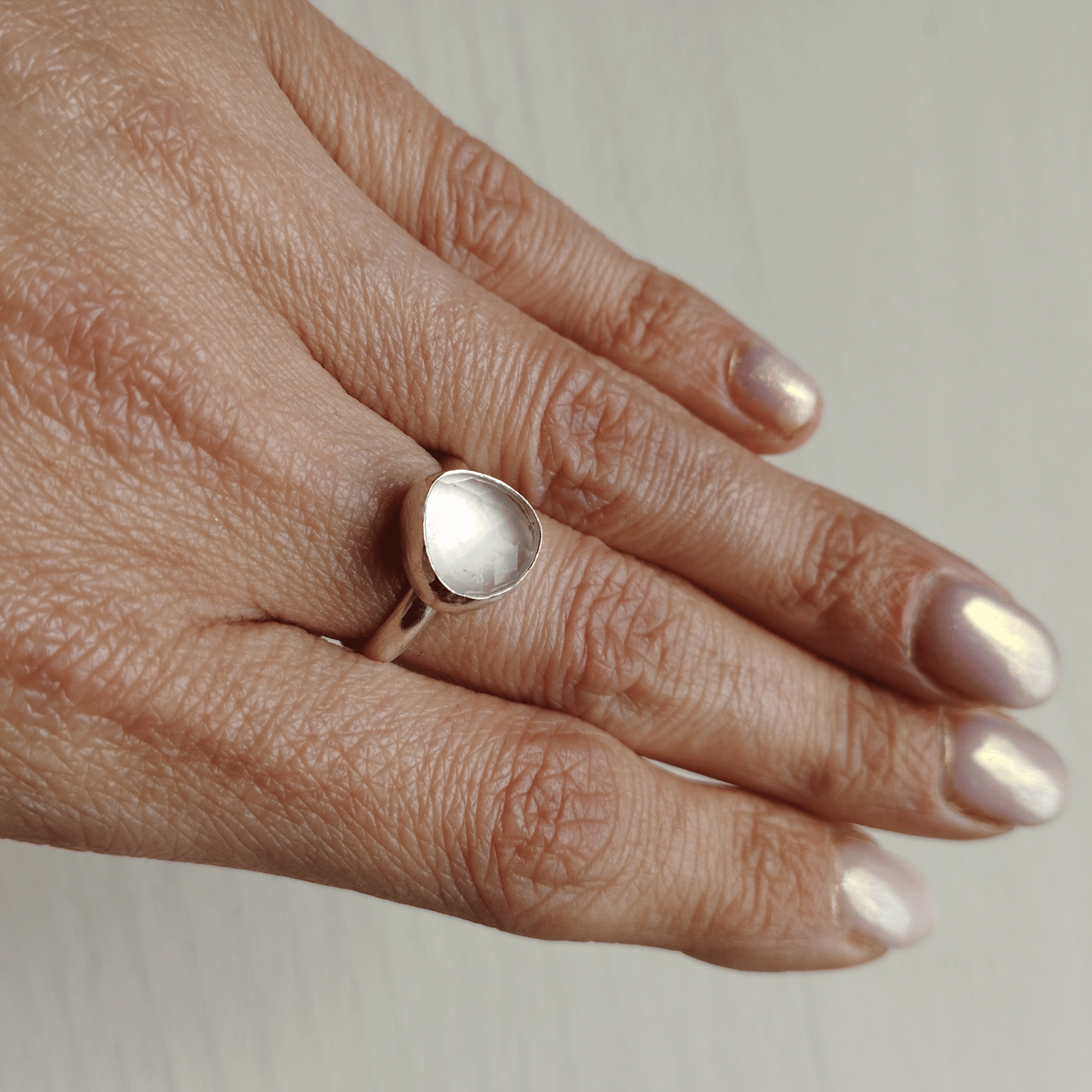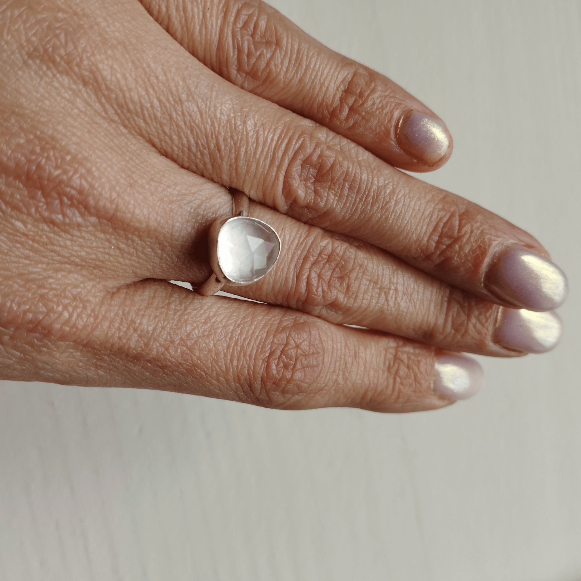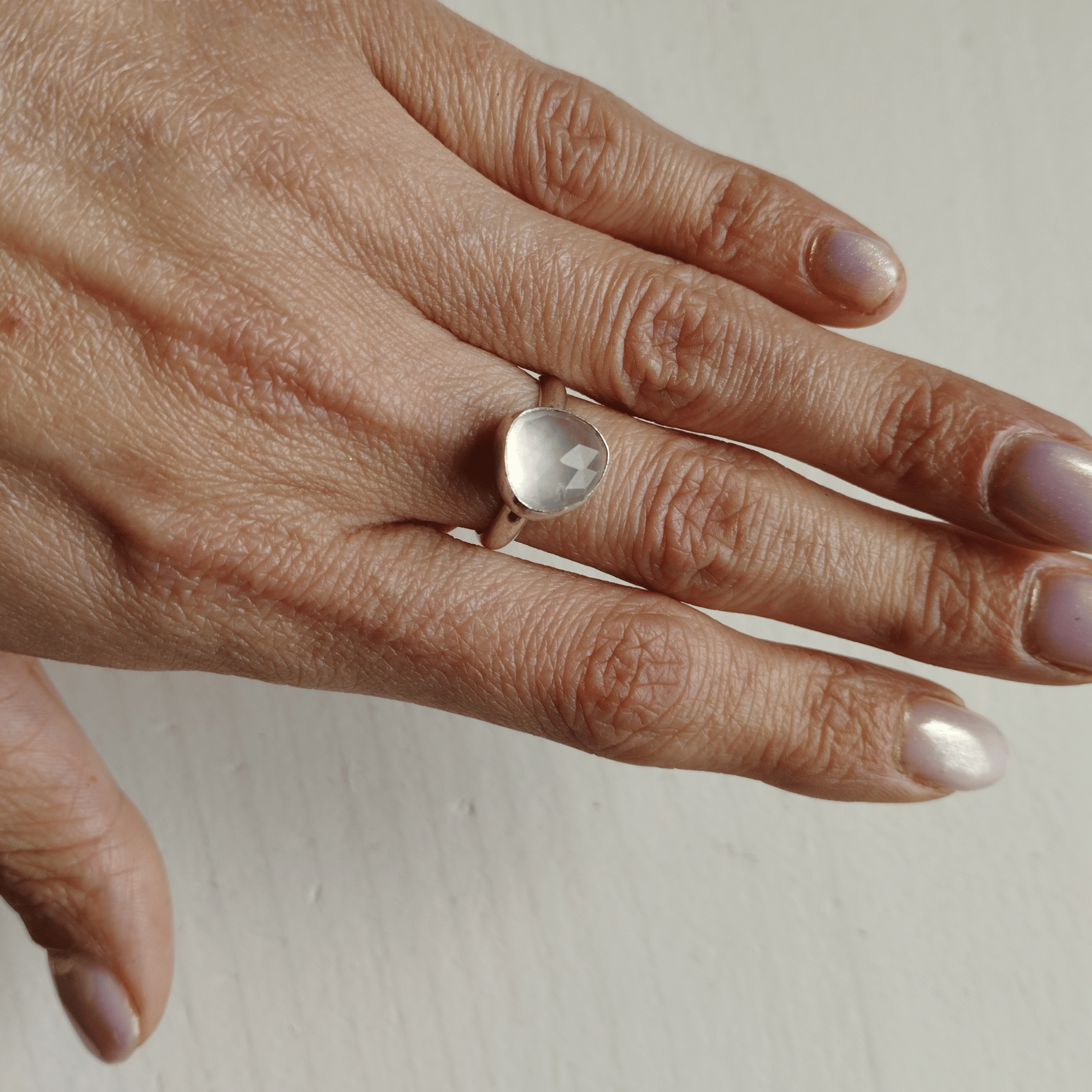 Cette bague artisanale en quartz rose et argent sterling 925 s’accompagne de sa pochette.
