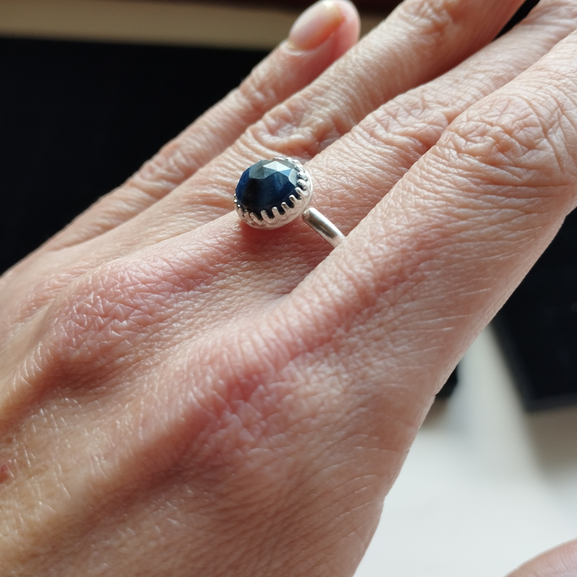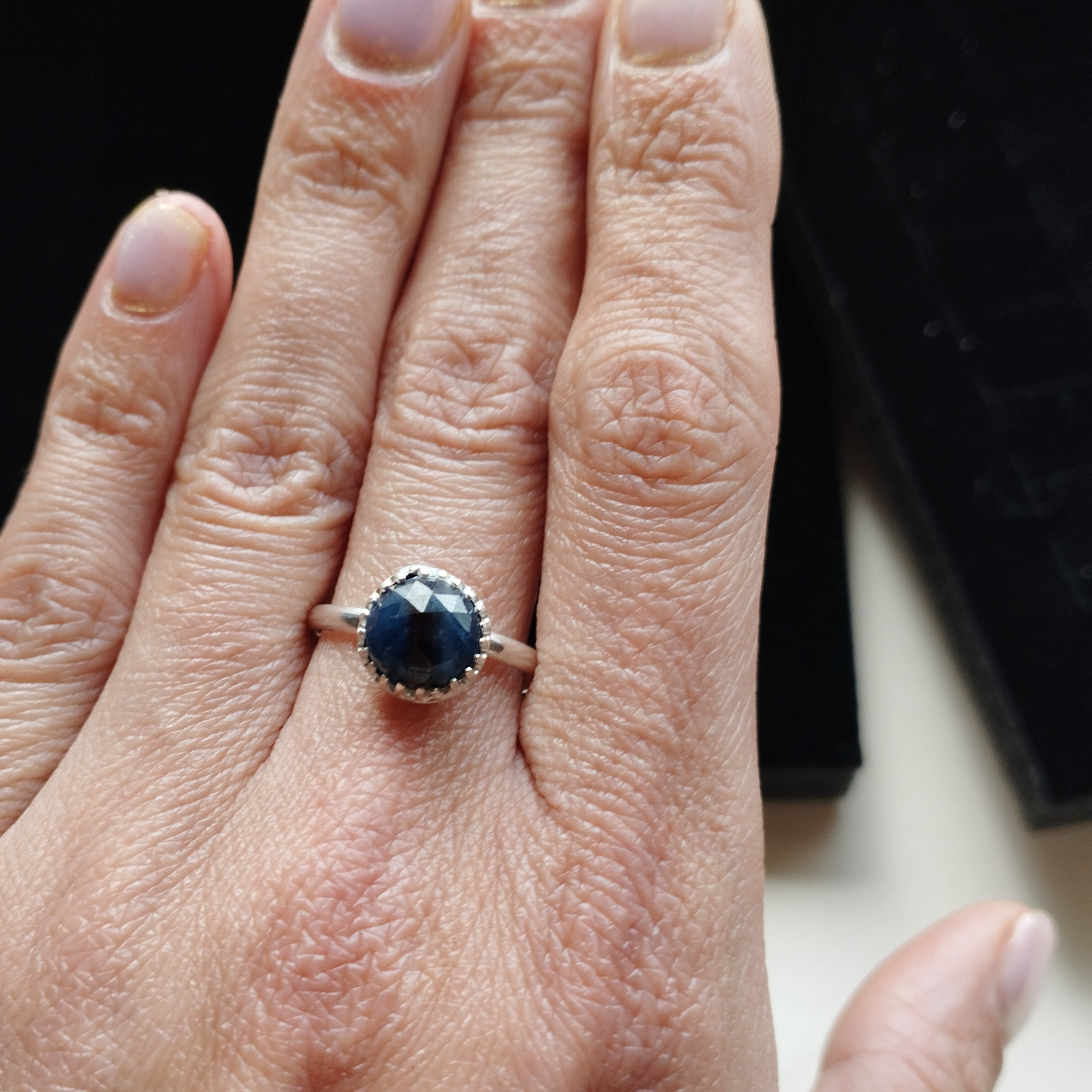 Cette bague artisanale en saphir bleu et argent sterling 925 s’accompagne de sa pochette. Chaque bague est une pièce unique car les matériaux naturels ont des aspérités.