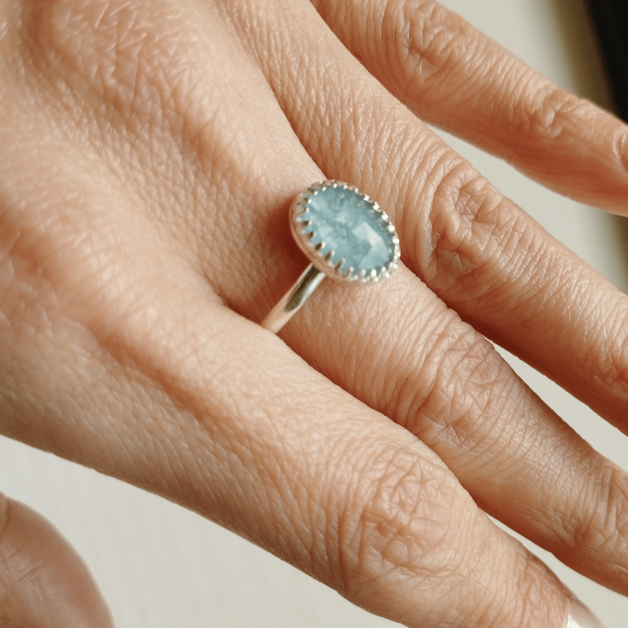 Cette bague artisanale en cyanite et argent sterling 925 s’accompagne de sa pochette.