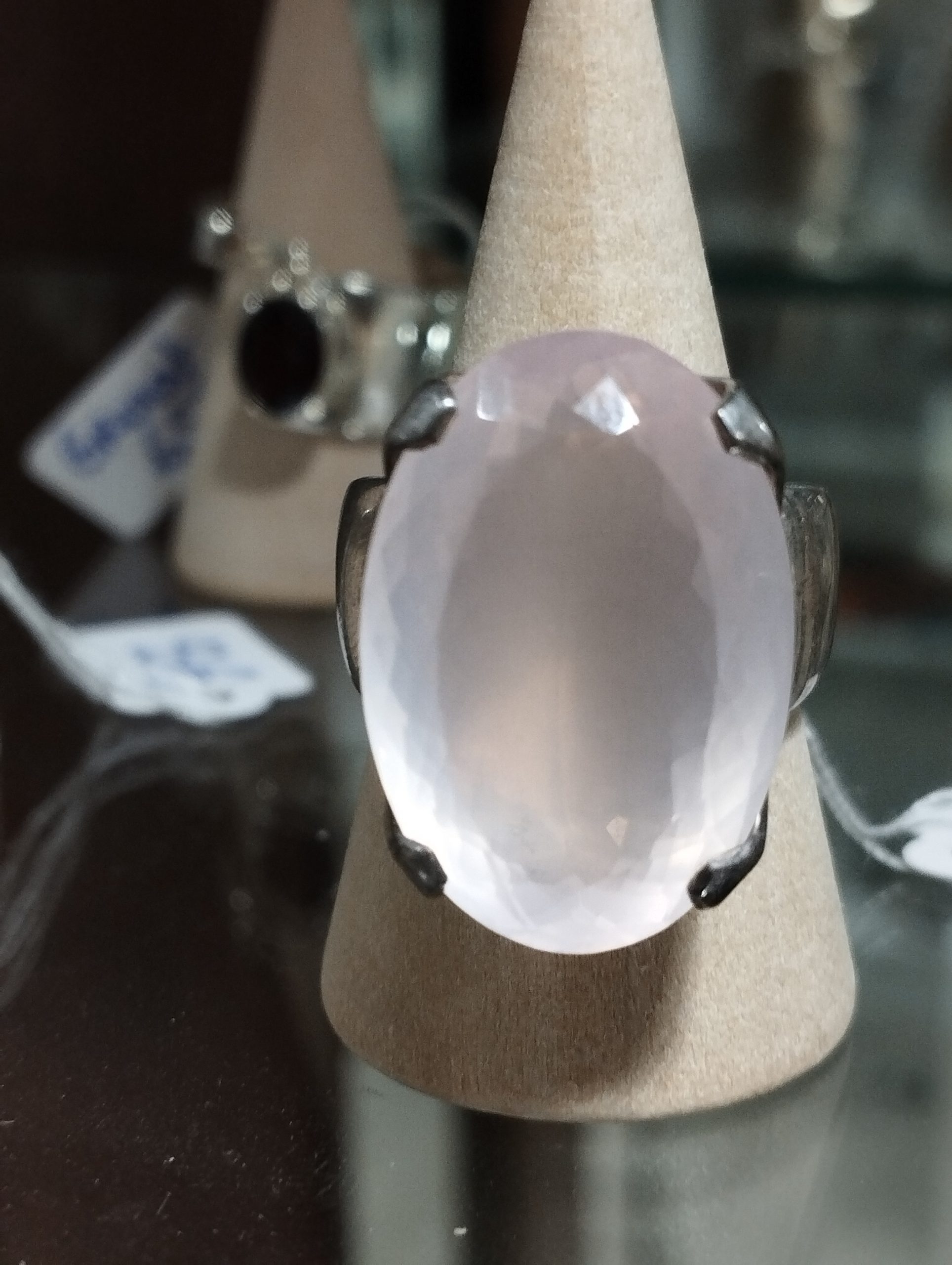 Cette bague XL en quartz rose à facettes et argent sterling 925 s’accompagne de sa boîte.