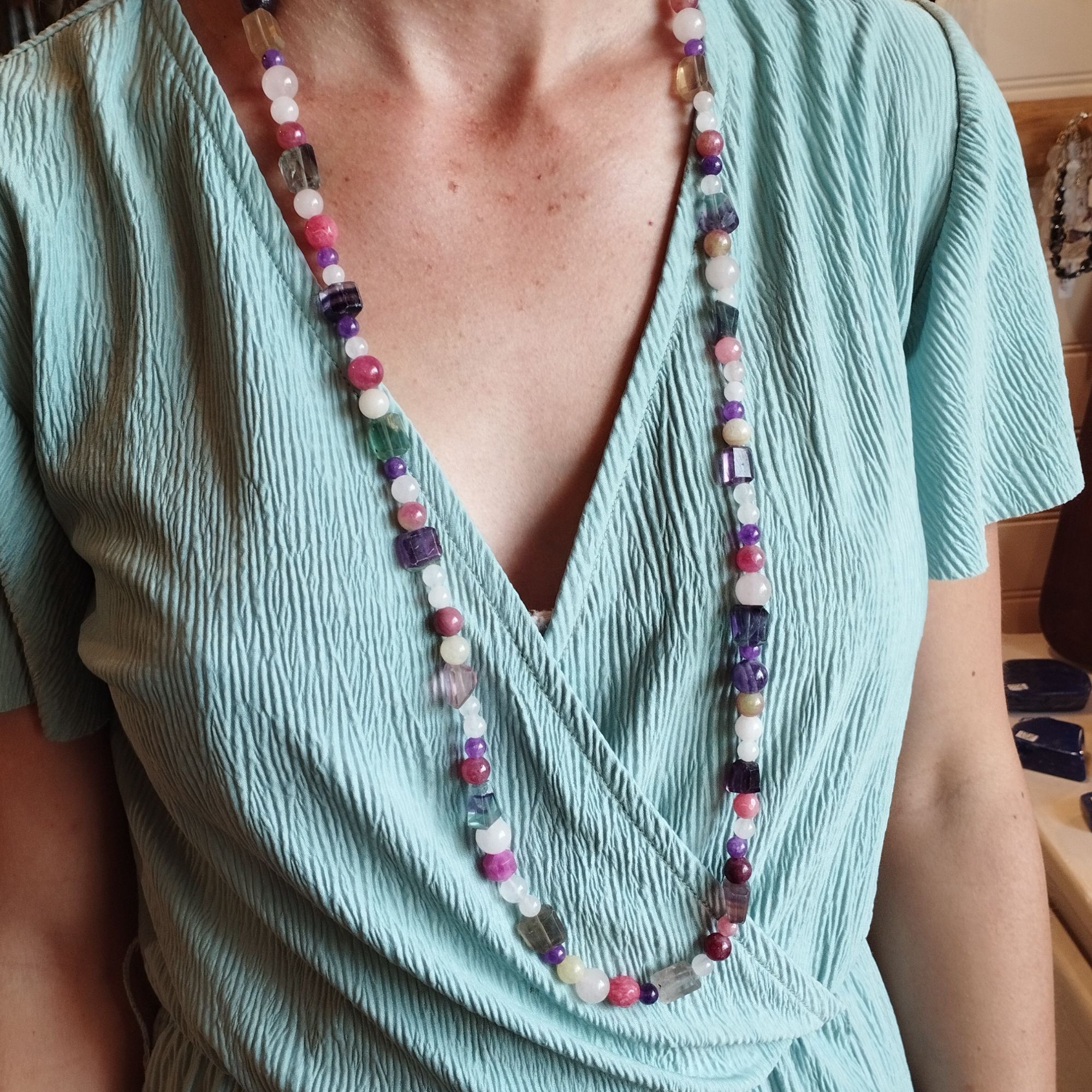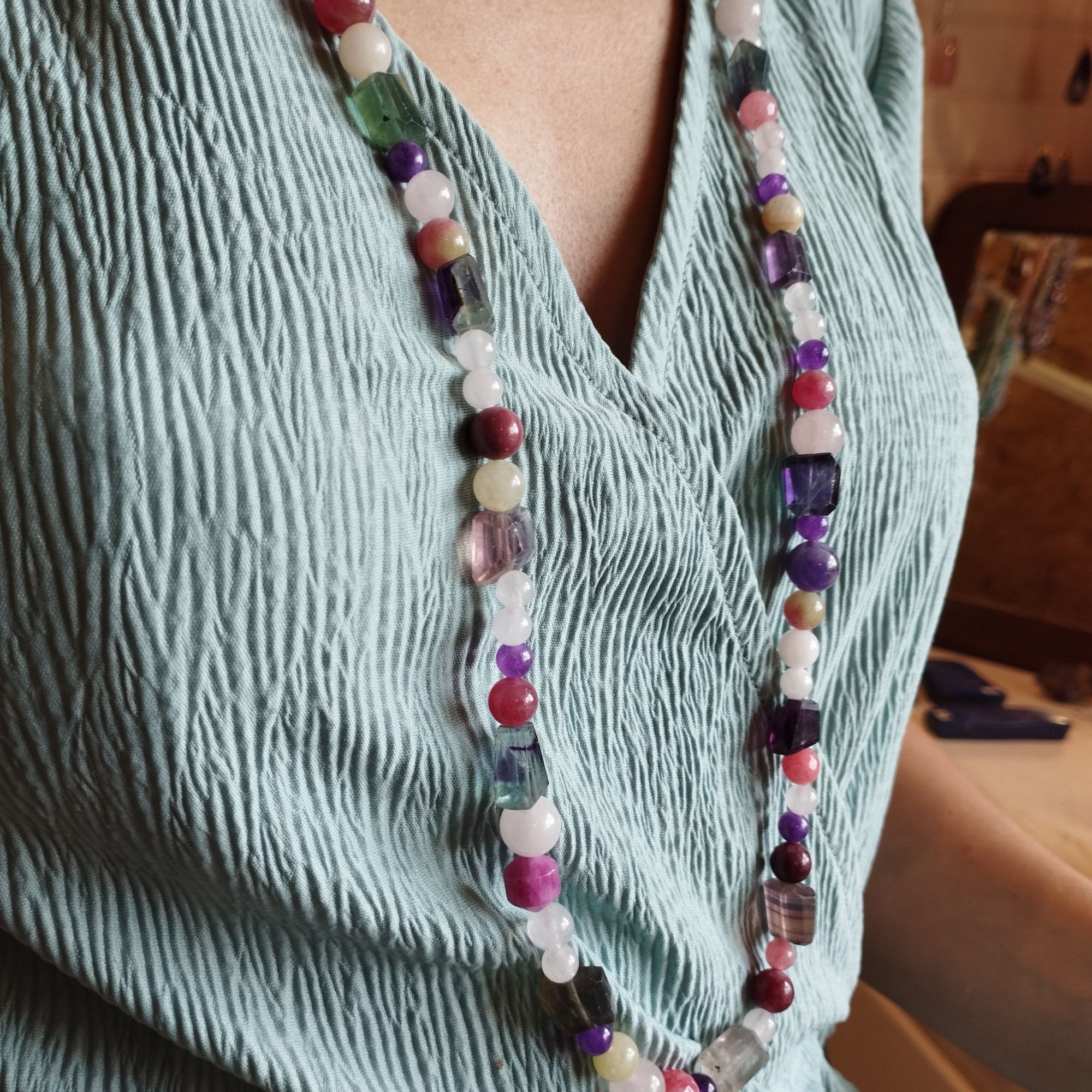 Les perles qui composent ce colliers sont : la fluorine, le quartz rose, la tourmaline, l’améthyste et le grenat.