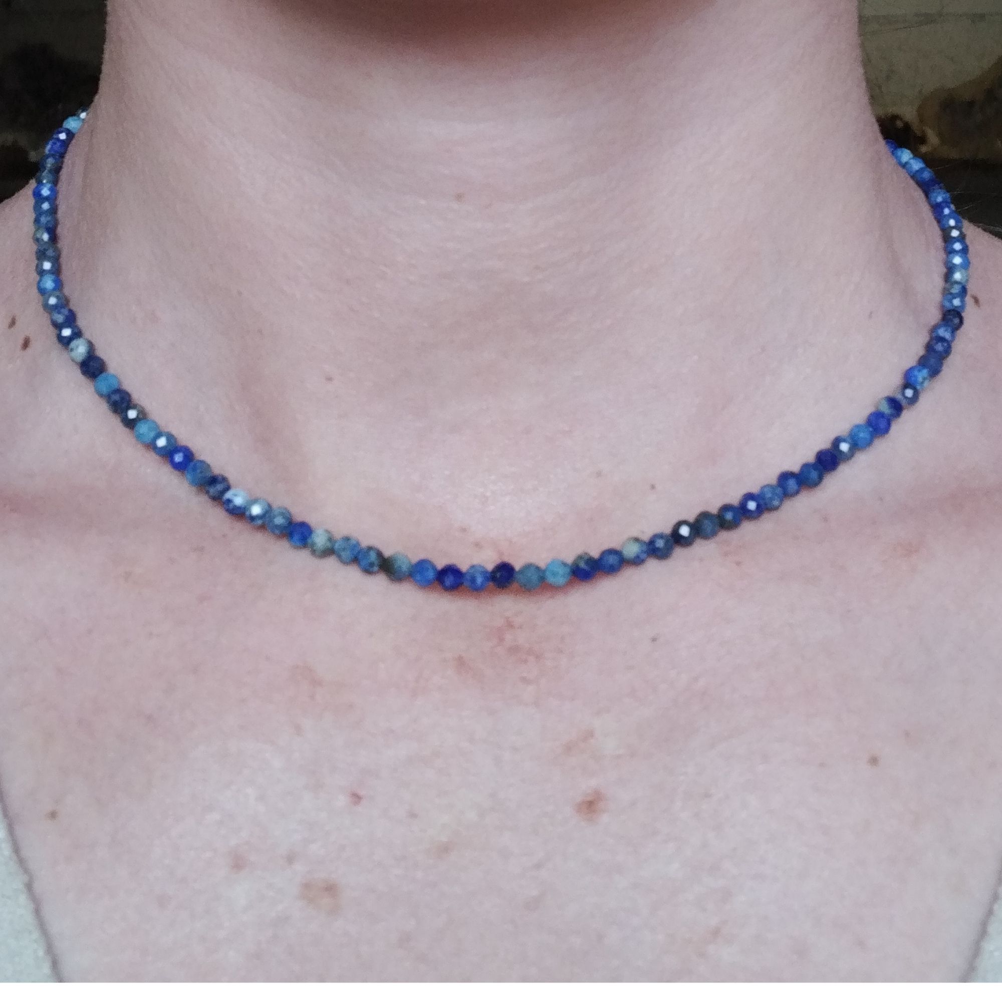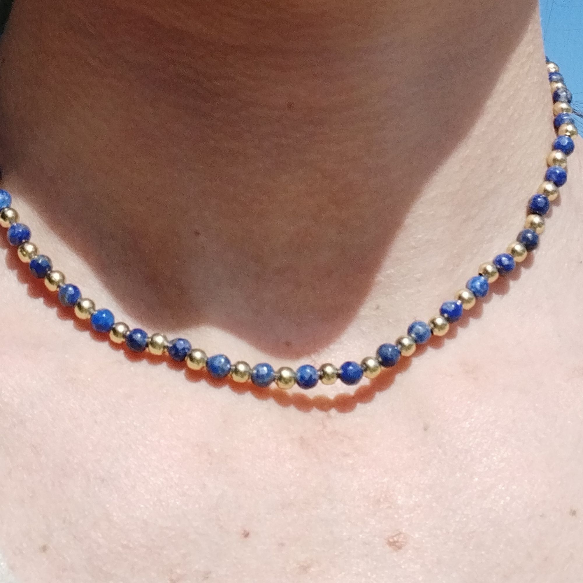 Ce collier en lapis lazuli est monté en perles de 1 mm.