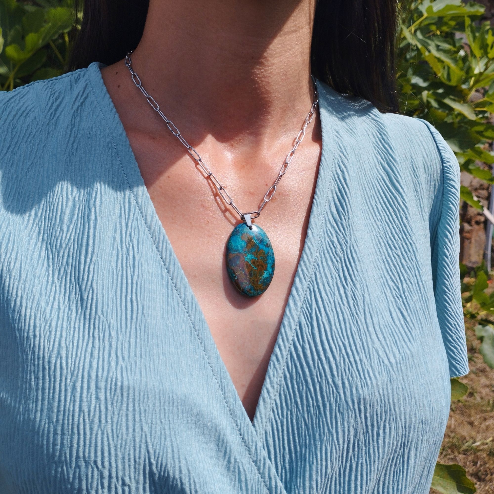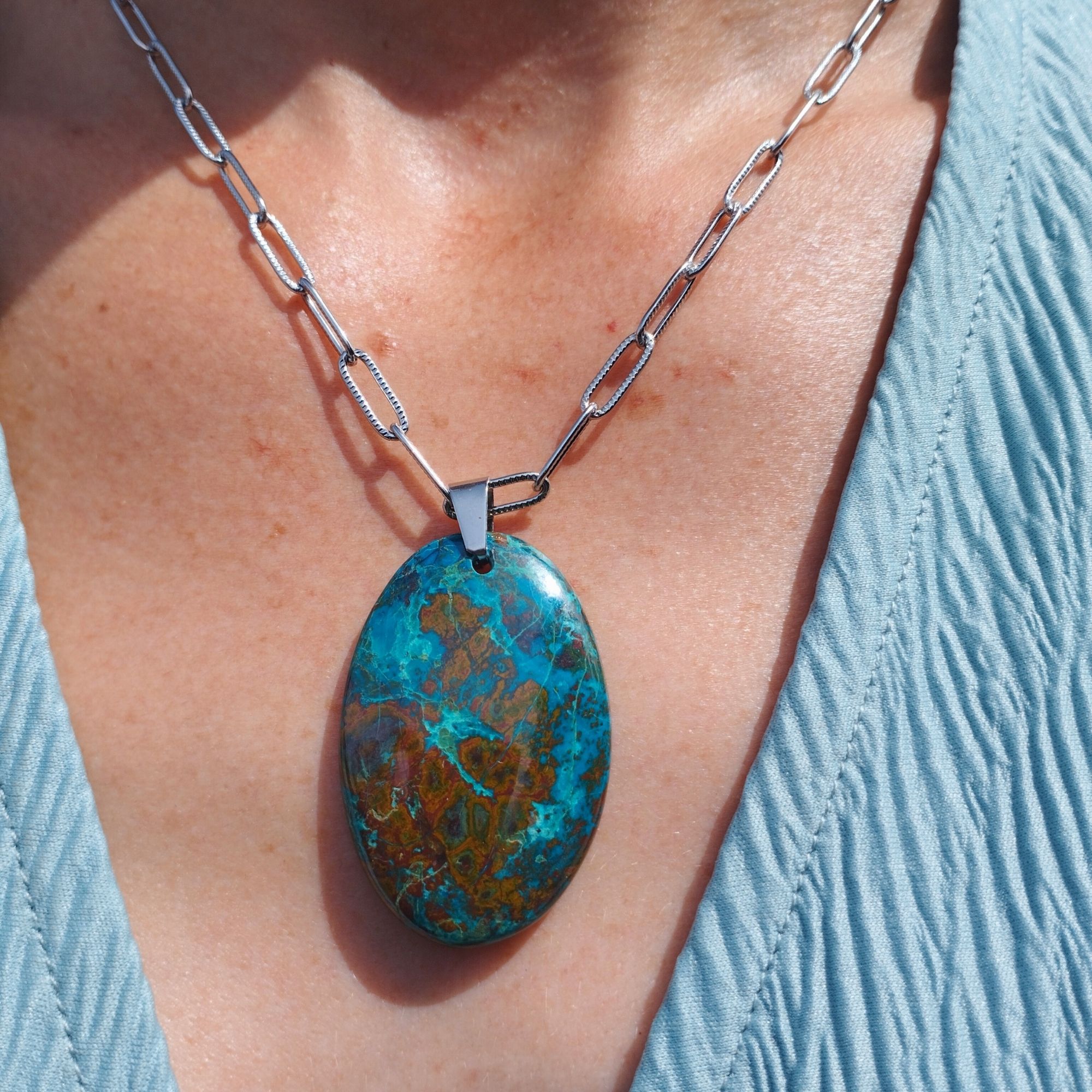 • La chrysocolle est réputée pour son effet extrêmement calmant. Elle aide à soulager le stress et les tensions, apportant une profonde paix intérieure. Elle est idéale pour ceux qui cherchent à diminuer l’anxiété ou à gérer des émotions fortes.