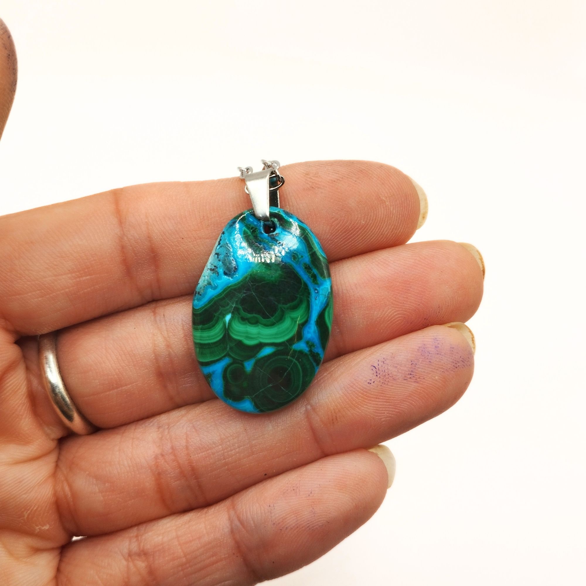 ✔️ Nos pendentifs, dont celui-ci en chrysocolle et malachite, sont réalisés dans notre atelier, dans le département du Cantal (France).Nous vous accueillons volontiers à la boutique atelier au cœur des volcans d’Auvergne pour un atelier lapidaire, de sertissage ou bien encore pour en apprendre plus sur la lithothérapie .