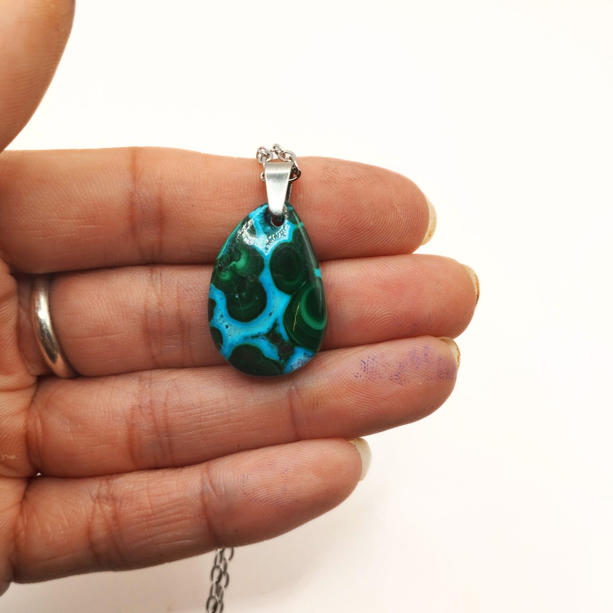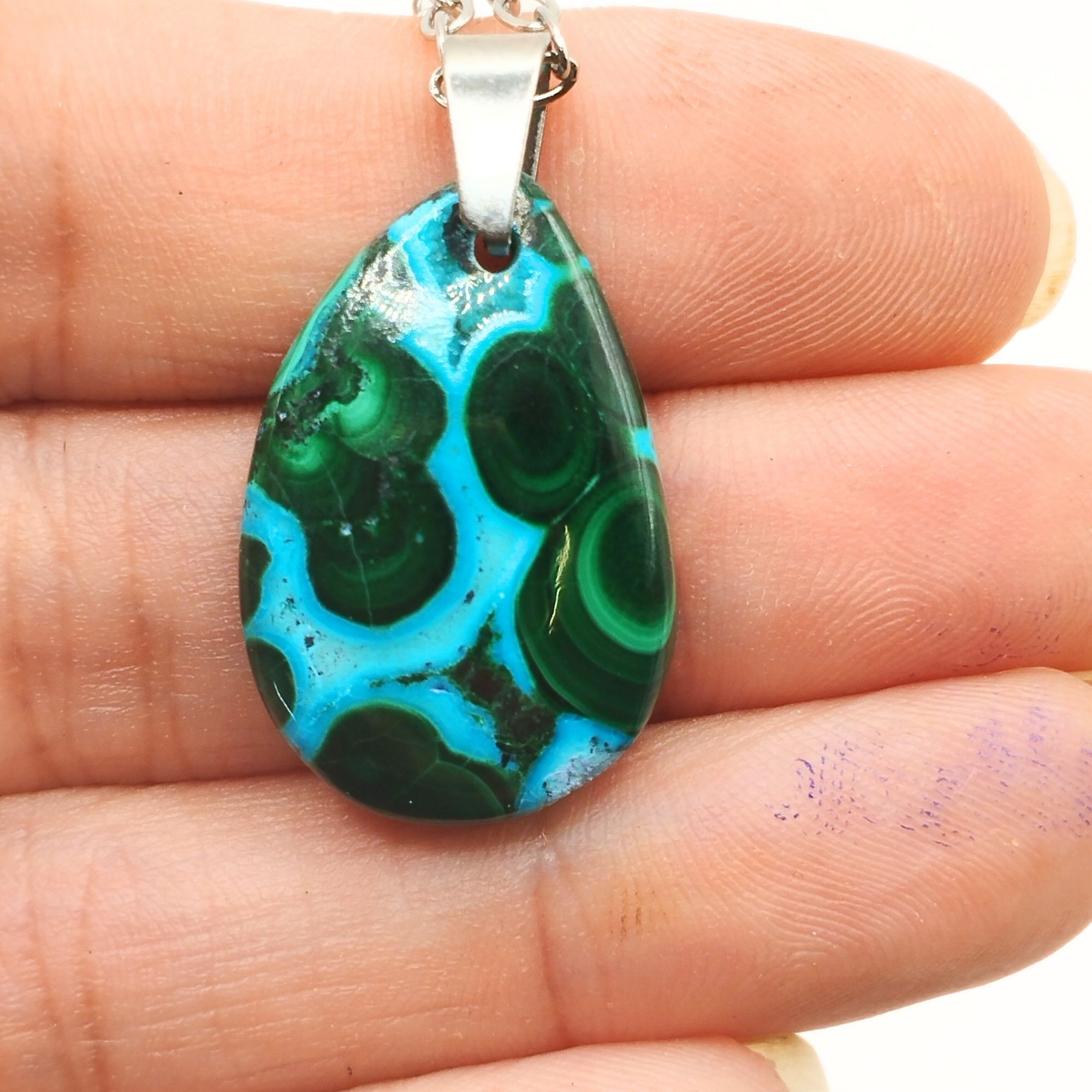 ✔️ Nos pendentifs, dont celui-ci en chrysocolle et malachite, sont réalisés dans notre atelier, dans le département du Cantal (France).Nous vous accueillons volontiers à la boutique atelier au cœur des volcans d’Auvergne pour un atelier lapidaire, de sertissage ou bien encore pour en apprendre plus sur la lithothérapie .