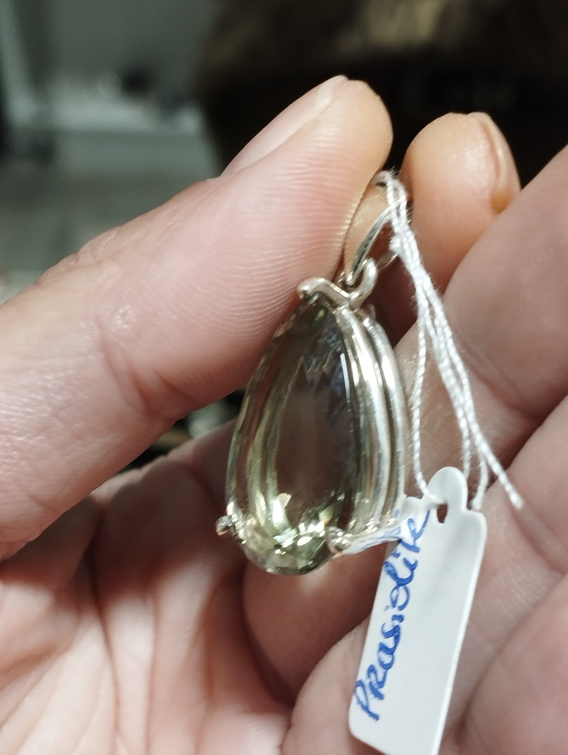 Ce pendentif en prasiolite à facettes et argent sterling 925 s’accompagne de sa boîte.