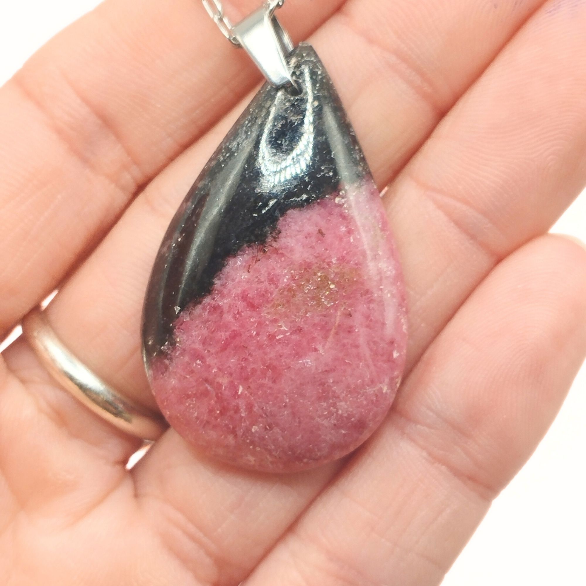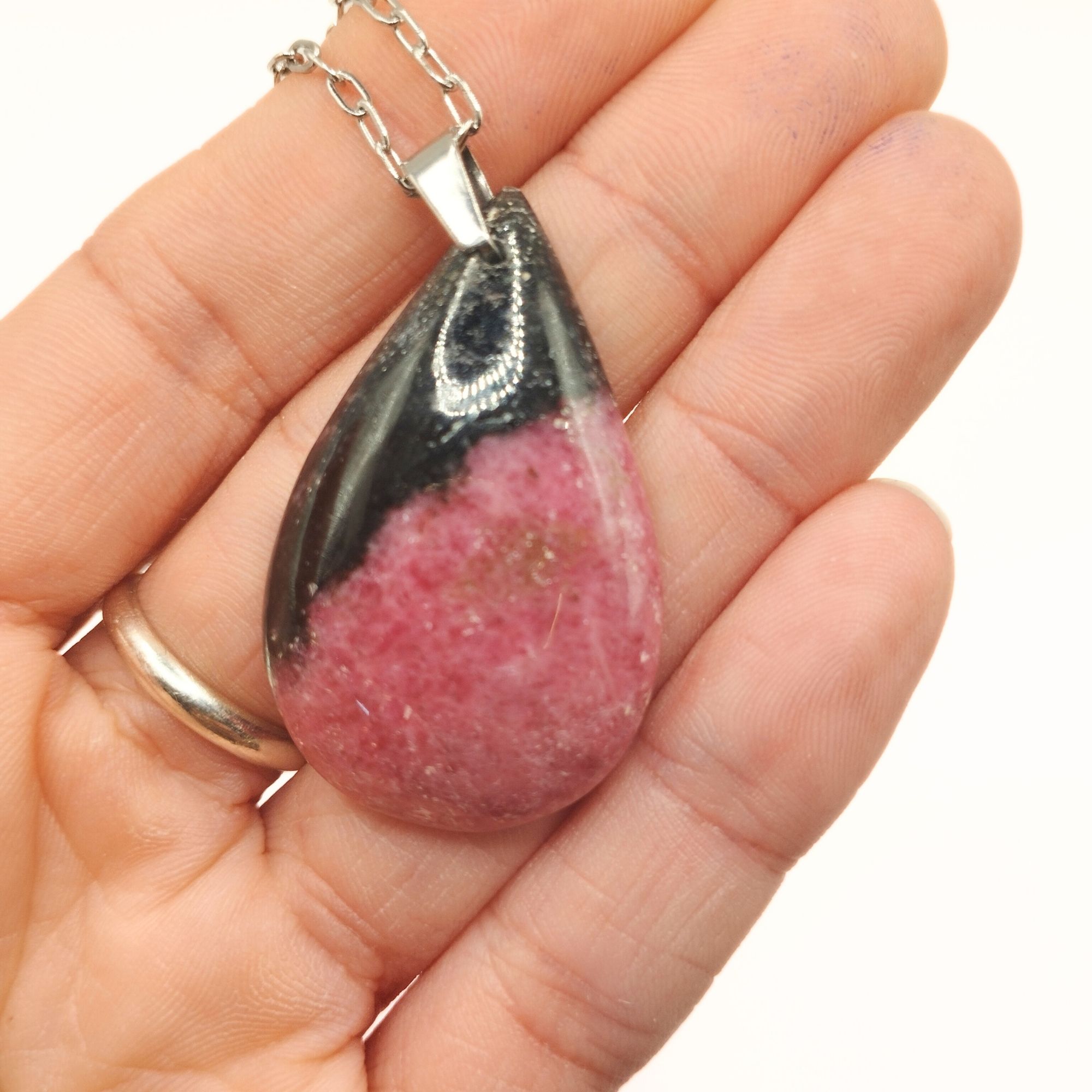 ✔️ Ce pendentif en rhodonite est réalisé dans notre atelier, dans le département du Cantal (France). Nous vous accueillons volontiers à la boutique atelier au cœur des volcans d’Auvergne pour un atelier lapidaire, de sertissage ou bien encore pour en apprendre plus sur la lithothérapie .