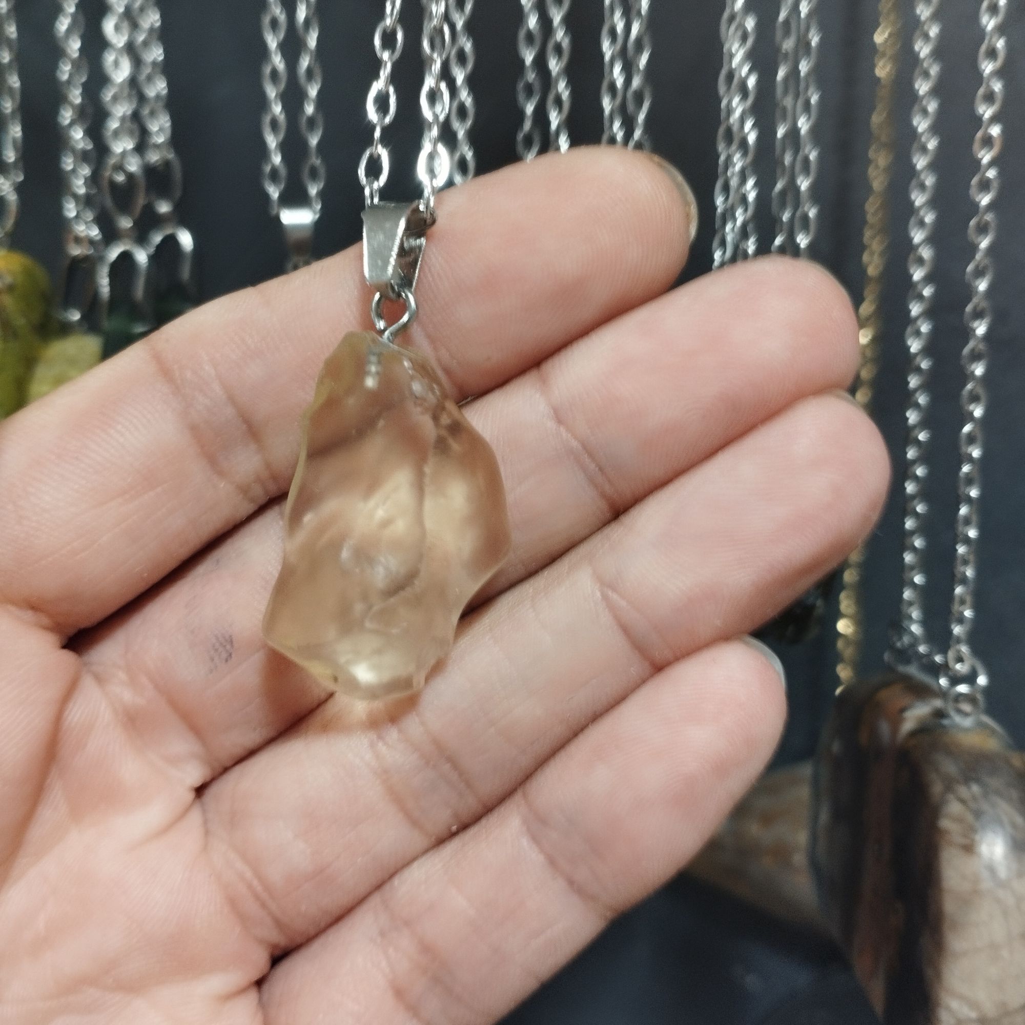 Le verre lybien est une pierre rare et mystérieuse, formée il y a environ 28 millions d’années par l’impact d’une météorite sur les sables du désert libyen. Sa teinte jaune doré évoque le soleil, la lumière et la puissance cosmique. Ce verre naturel, chargé d’une énergie très pure, agit comme un pont entre les plans terrestres et célestes. Il est reconnu pour élever la fréquence vibratoire de celui qui le porte et pour faciliter l’accès à des états de conscience supérieurs.