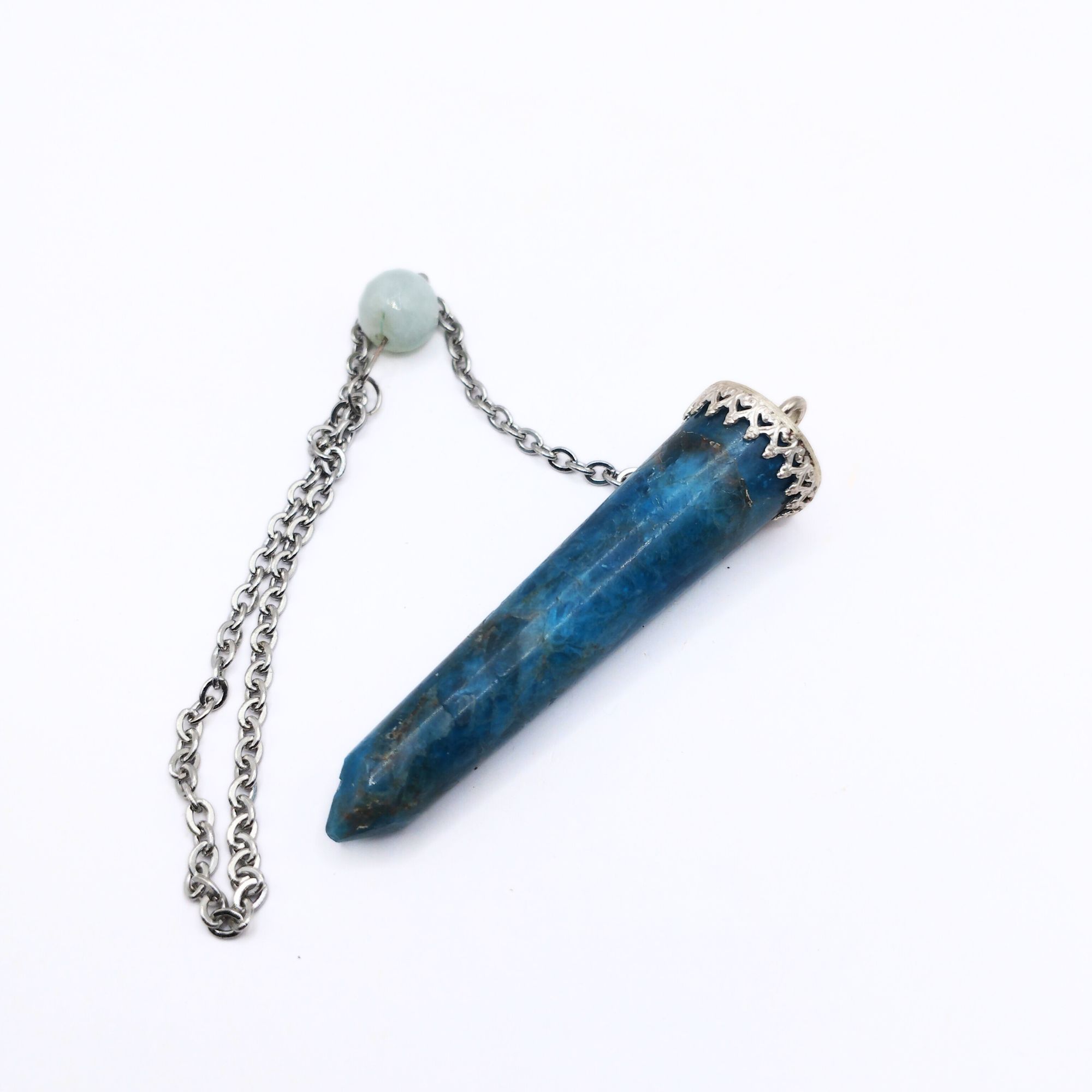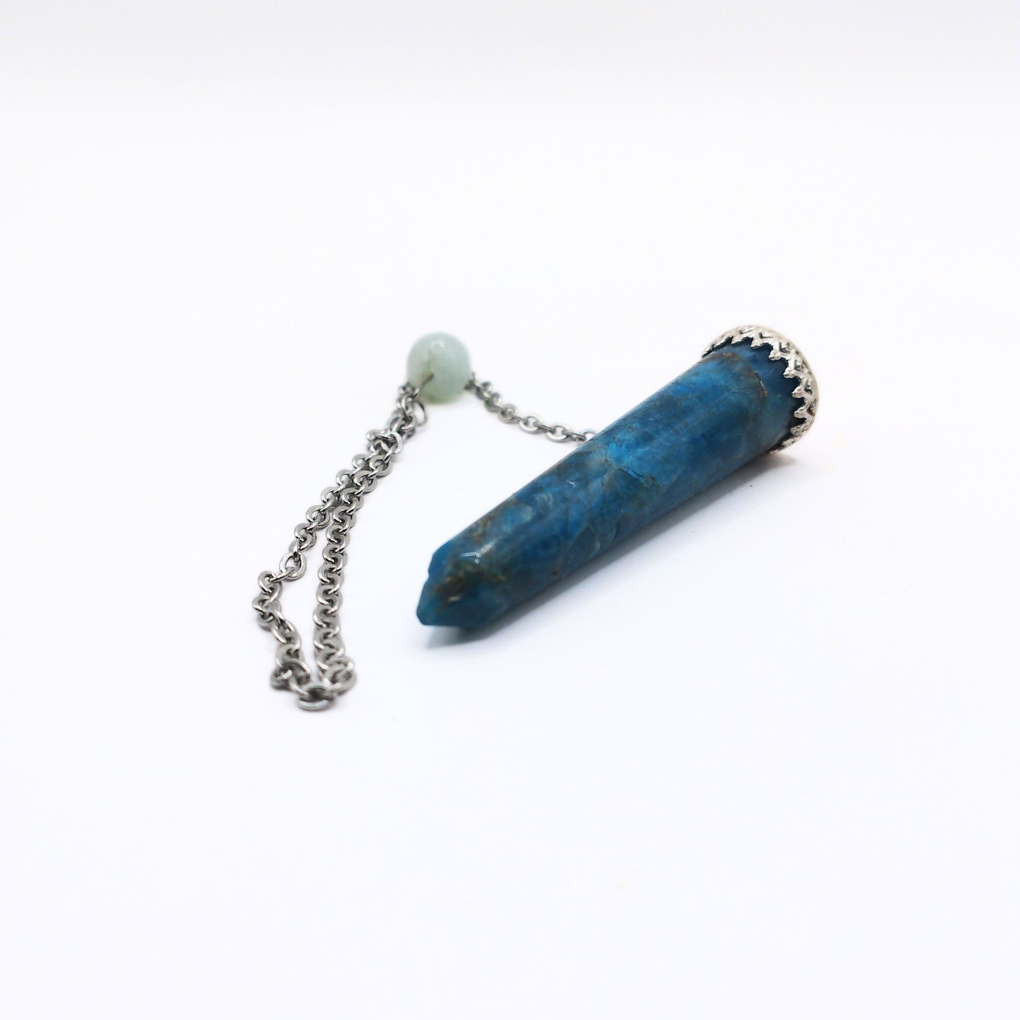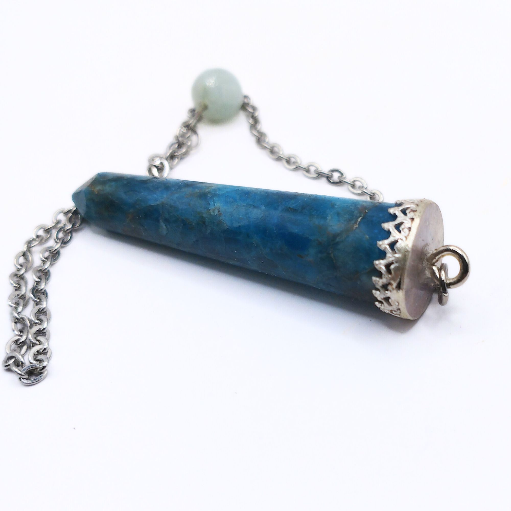 Ce pendule artisanal en argent 925 et pierre d’apatite est méticuleusement conçu à la main.