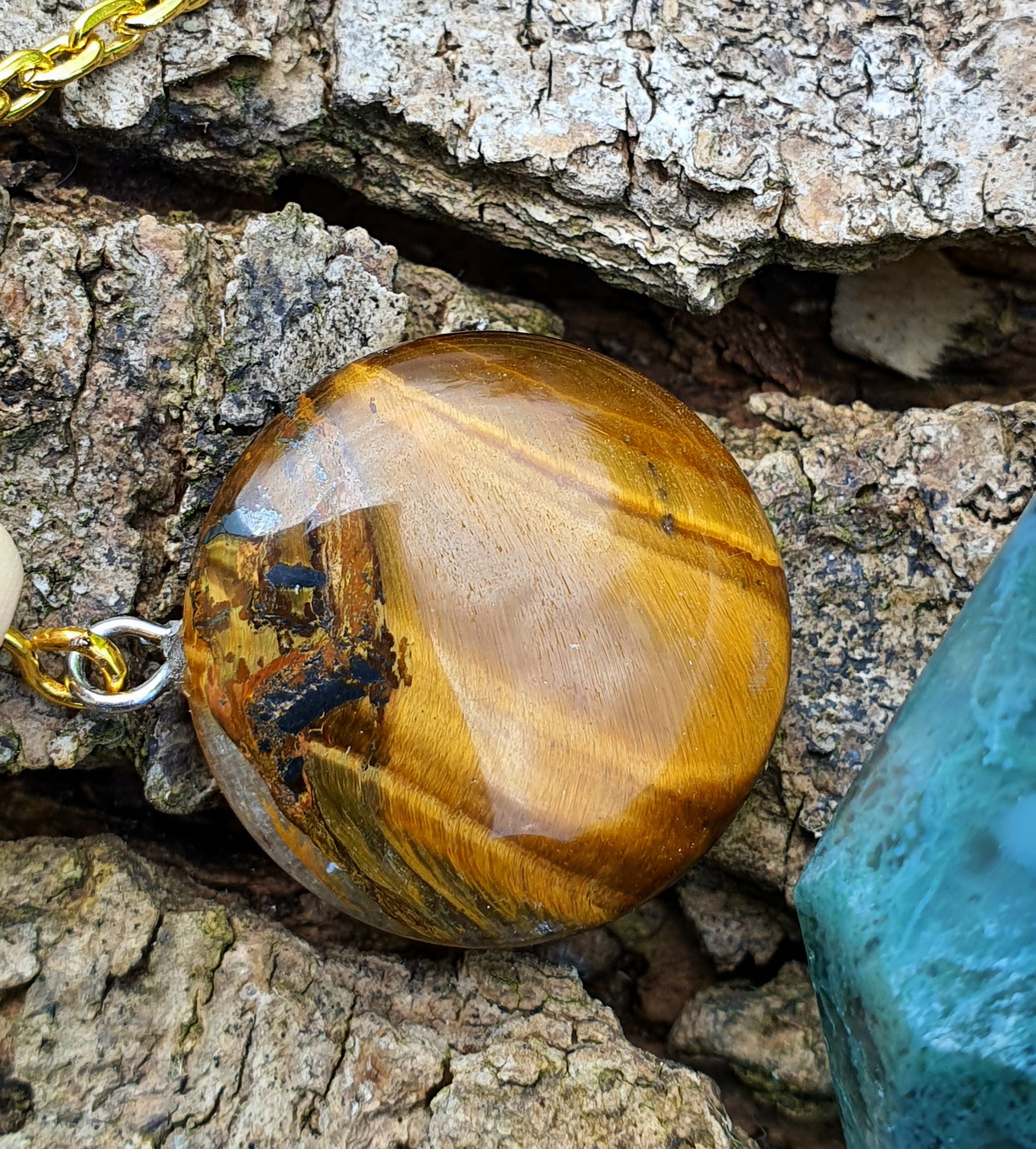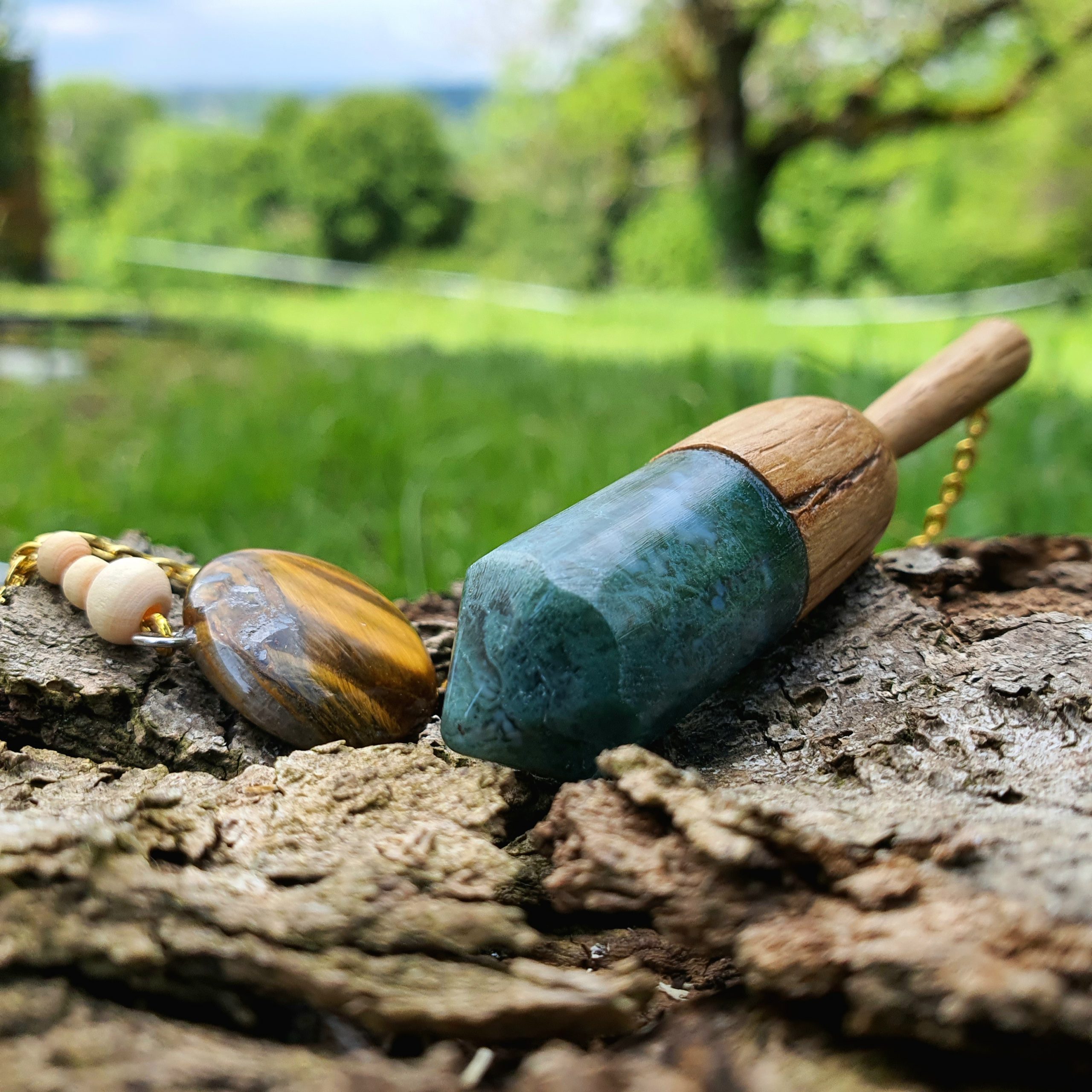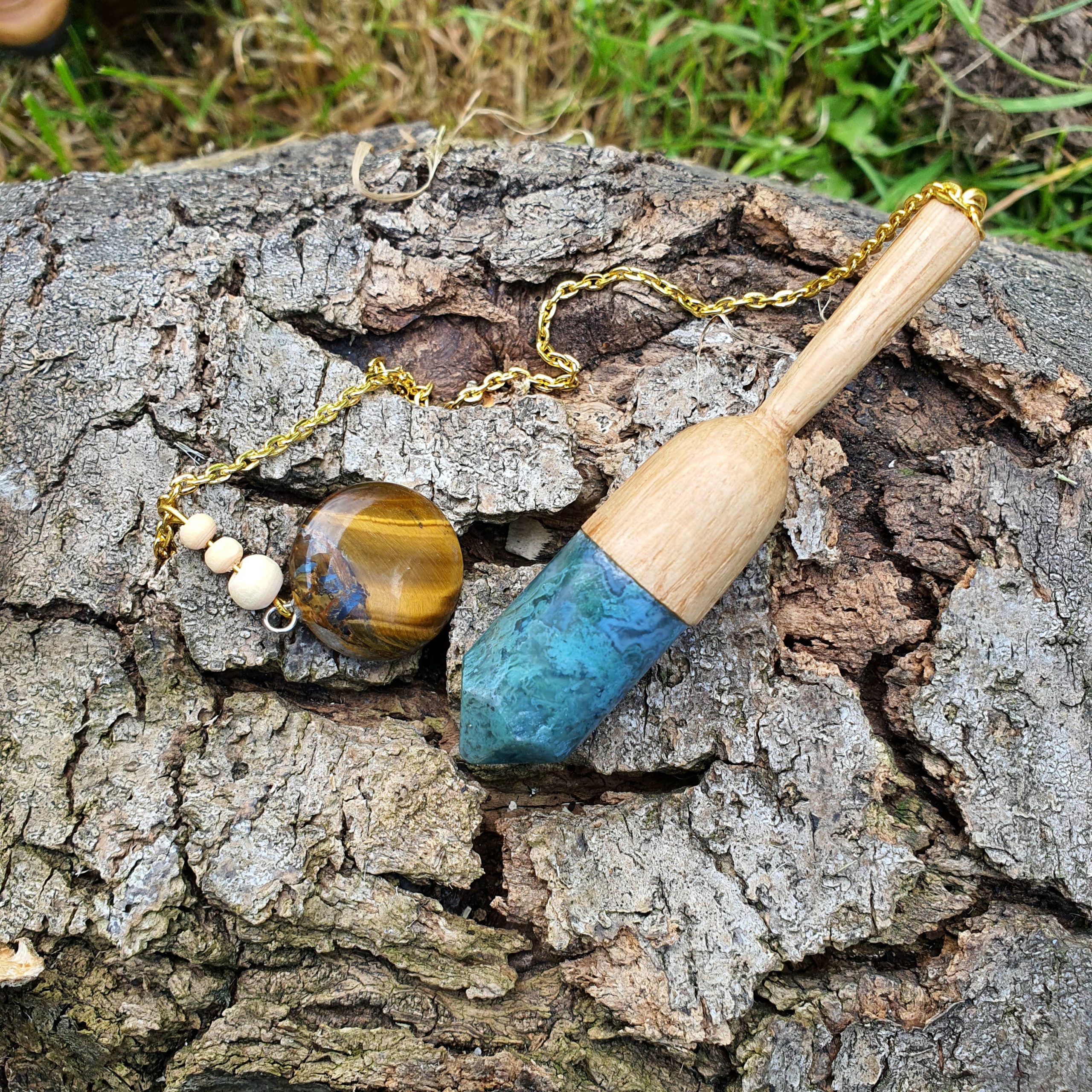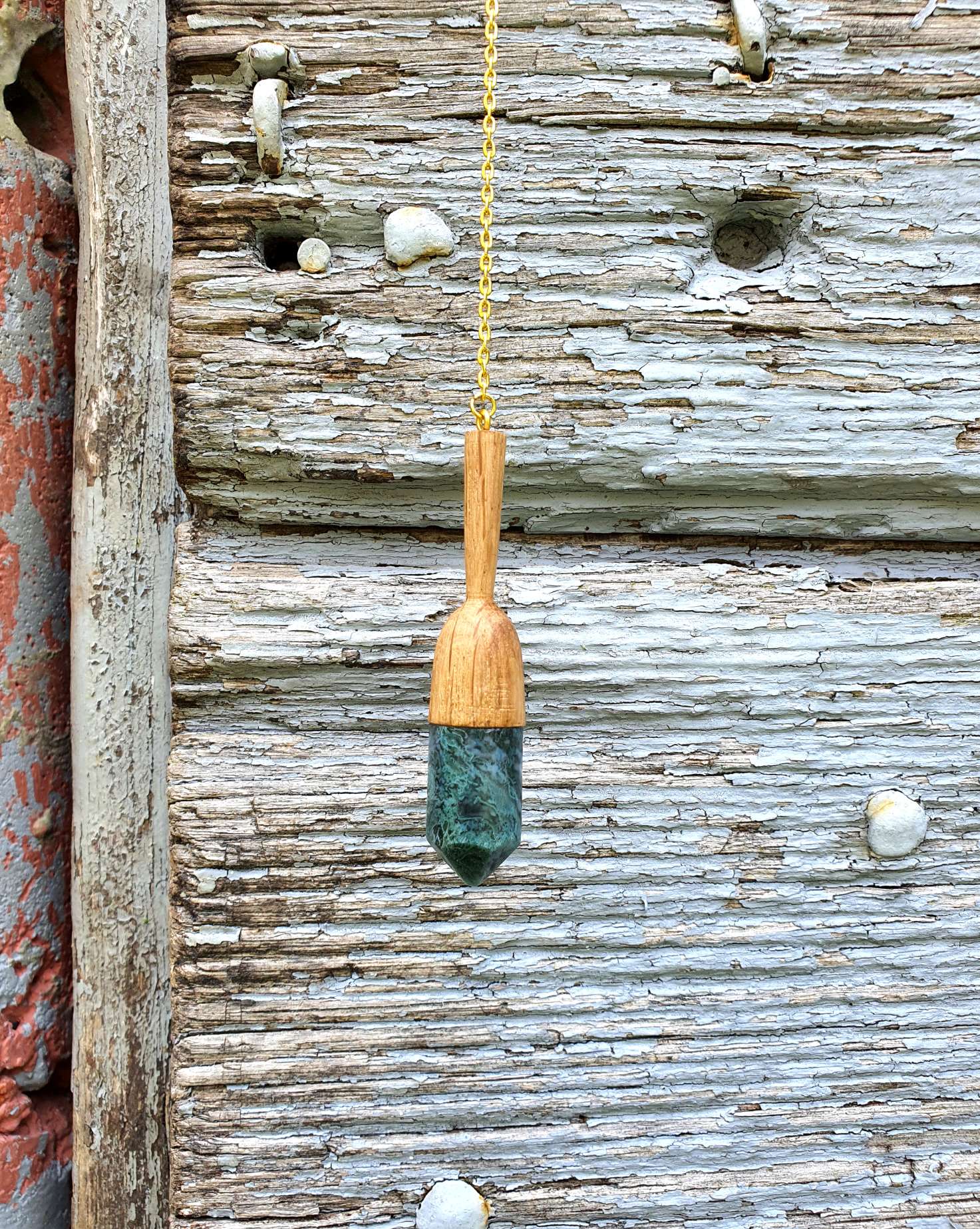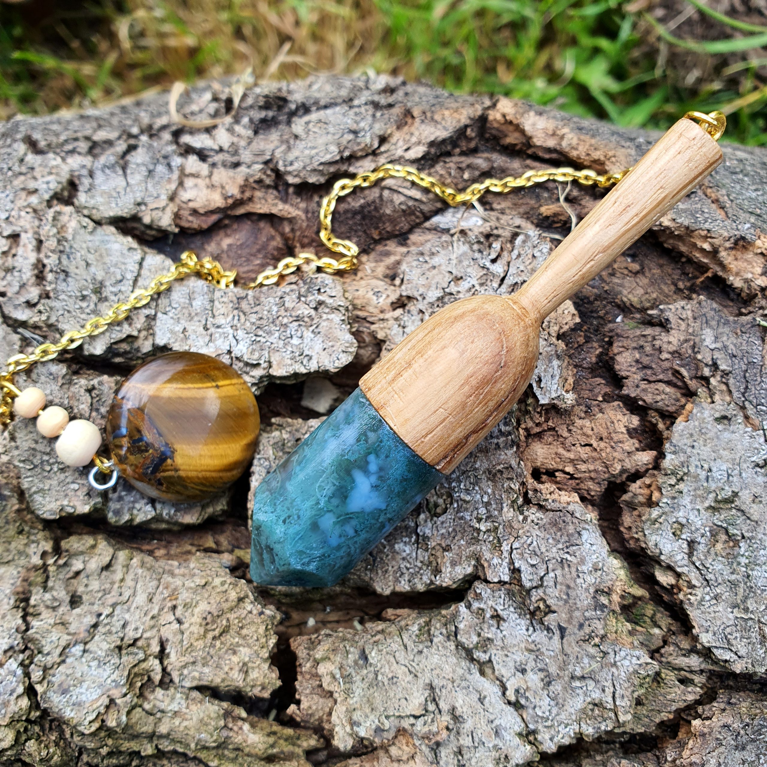 Ce pendule artisanal en bois de chêne et agate mousse est méticuleusement conçu à la main.