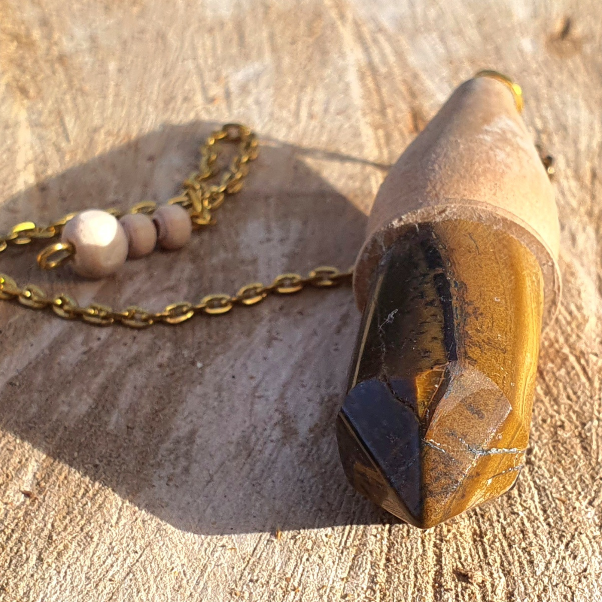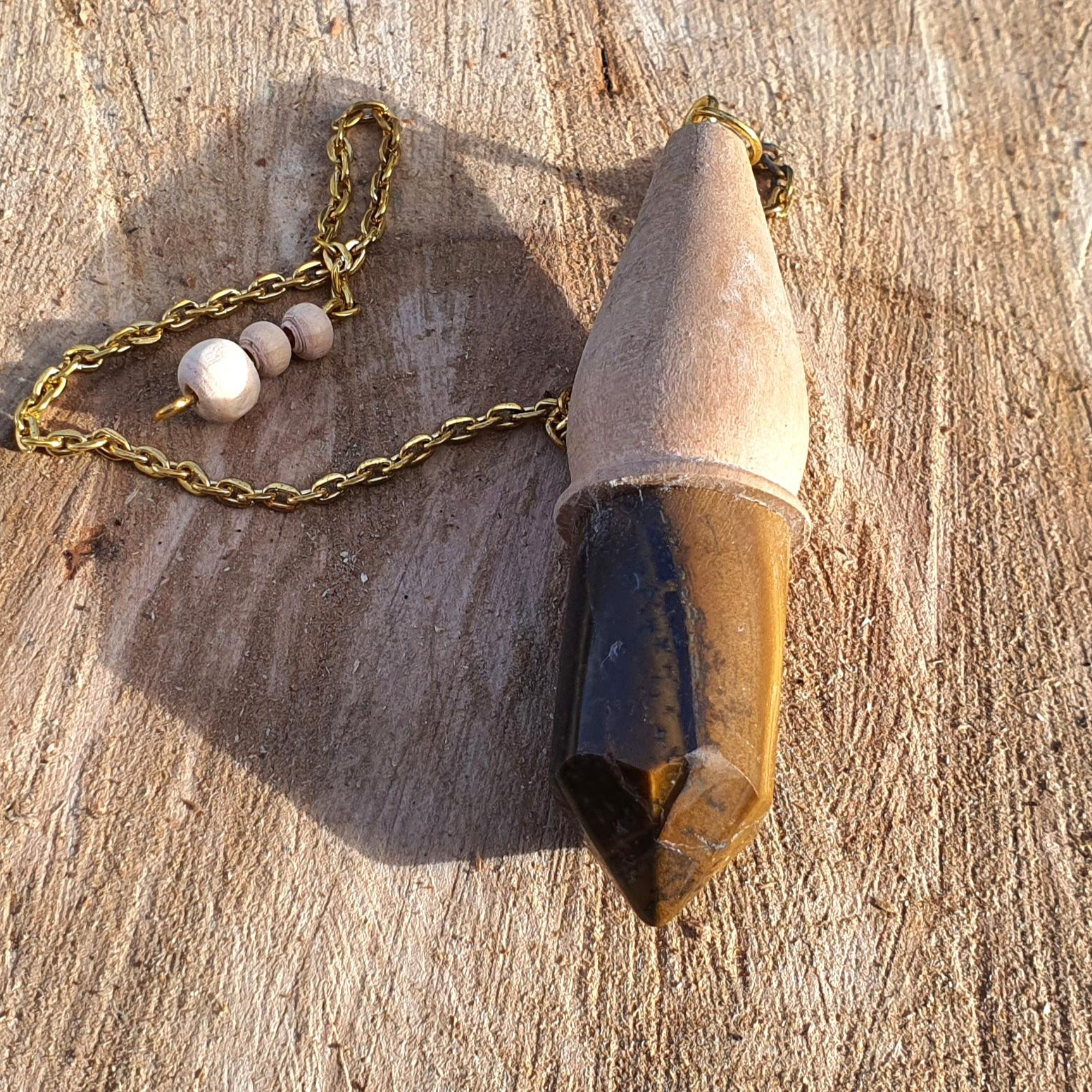 Ce pendule artisanal en bois de chêne et œil de tigre est méticuleusement conçu à la main.