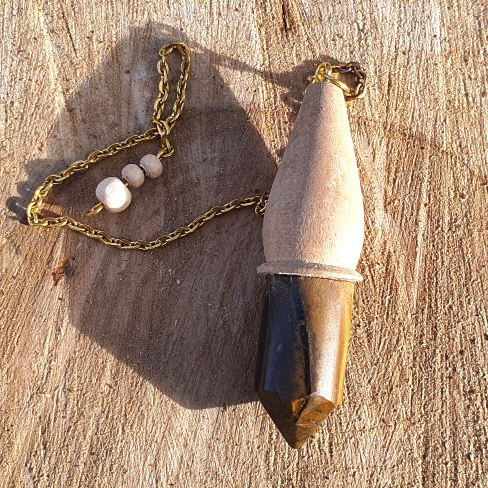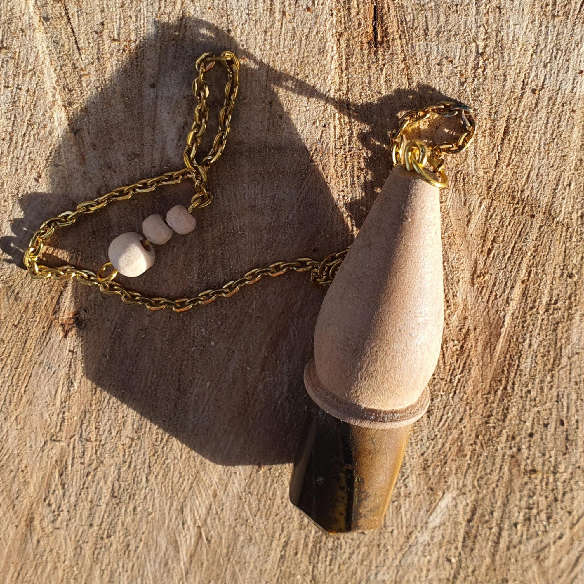 Ce pendule artisanal en bois de chêne et œil de tigre s’accompagne d’une pochette beige. Il est fabriqué à la main par mes soins à partir de bois et pierres brutes. Les matériaux naturels ont des aspérités, faisant de chaque pendule une pièce unique.