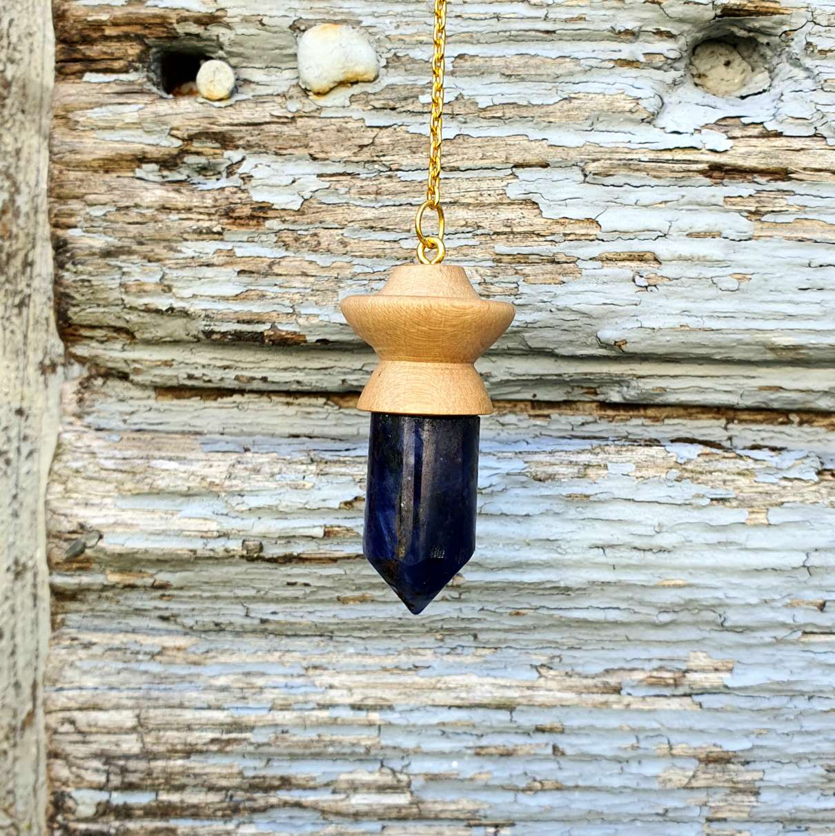 Ce pendule artisanal en bois de poirier et agate bleue est méticuleusement conçu à la main.