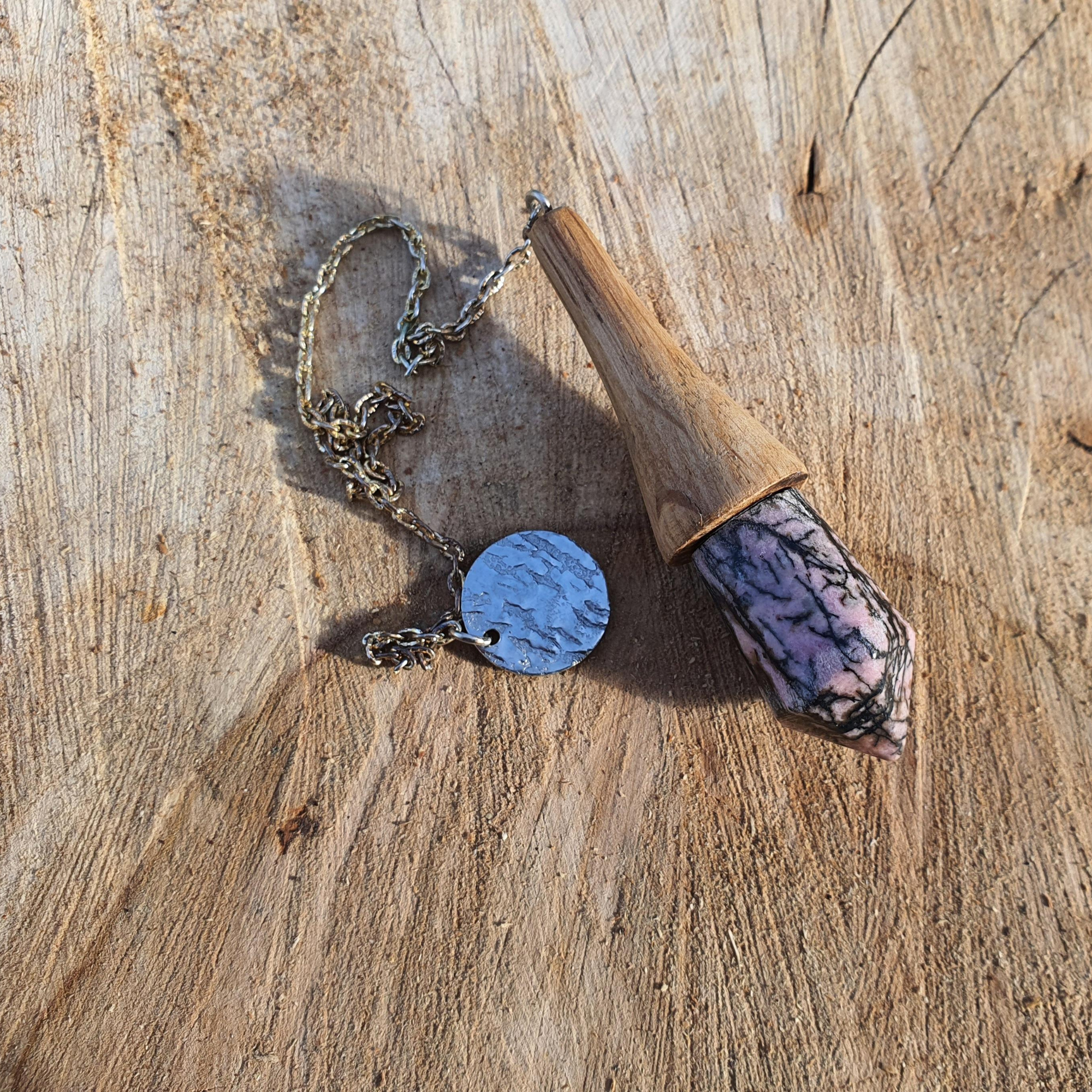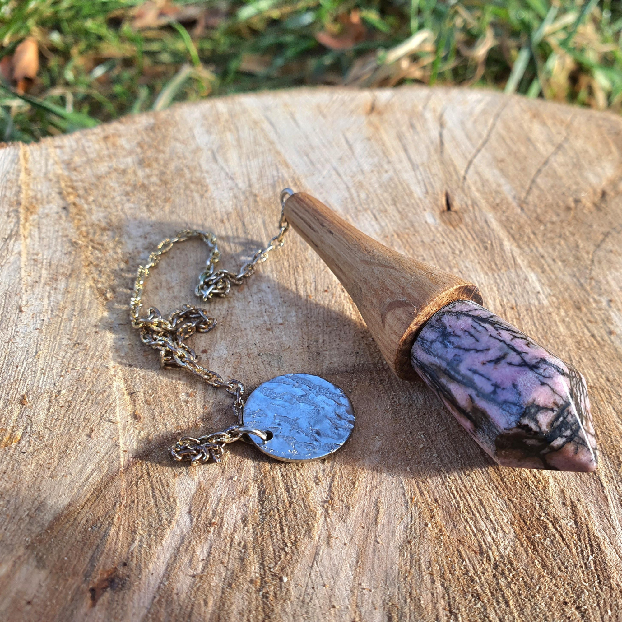 Ce pendule de soin en bois de chêne et rhodonite est méticuleusement conçu à la main.