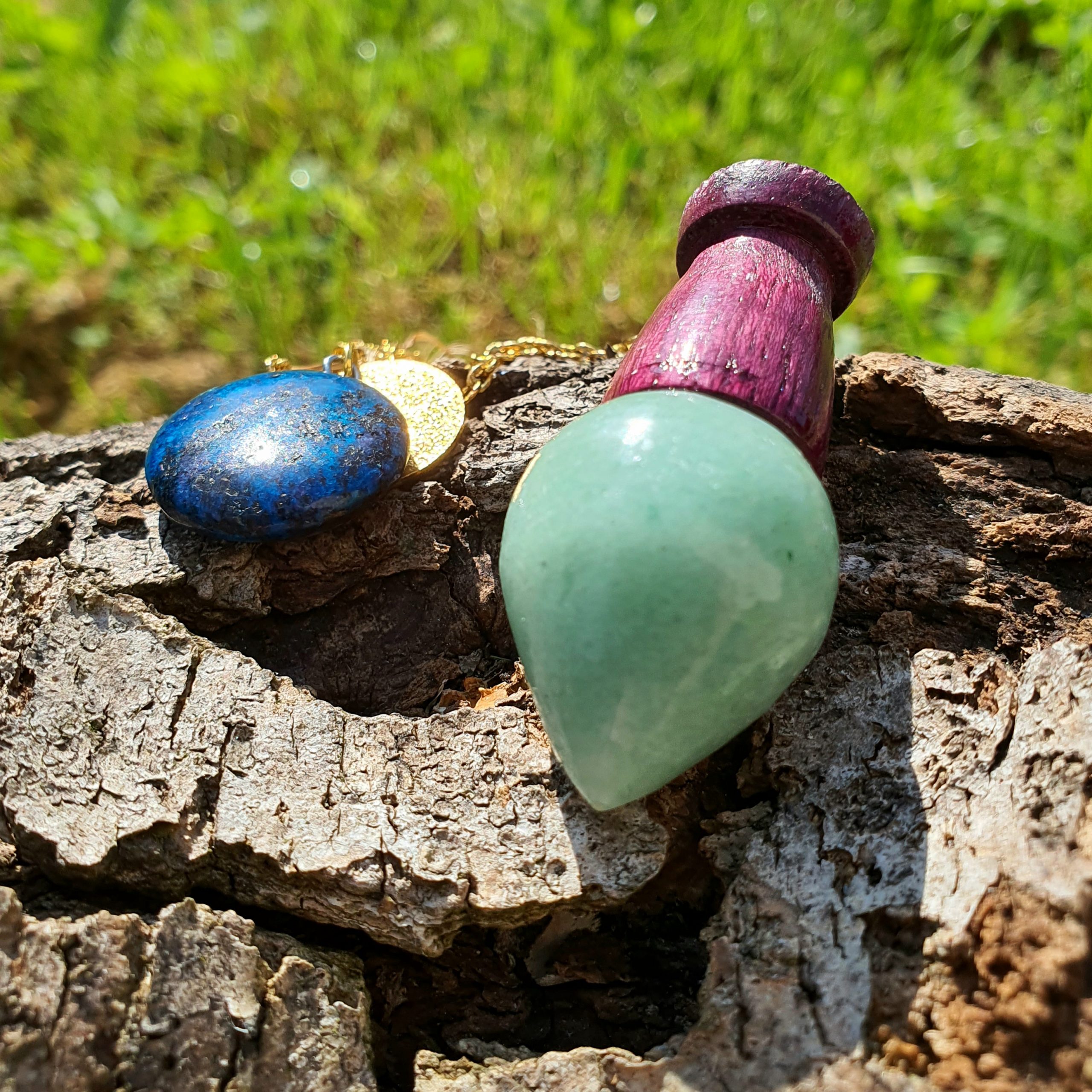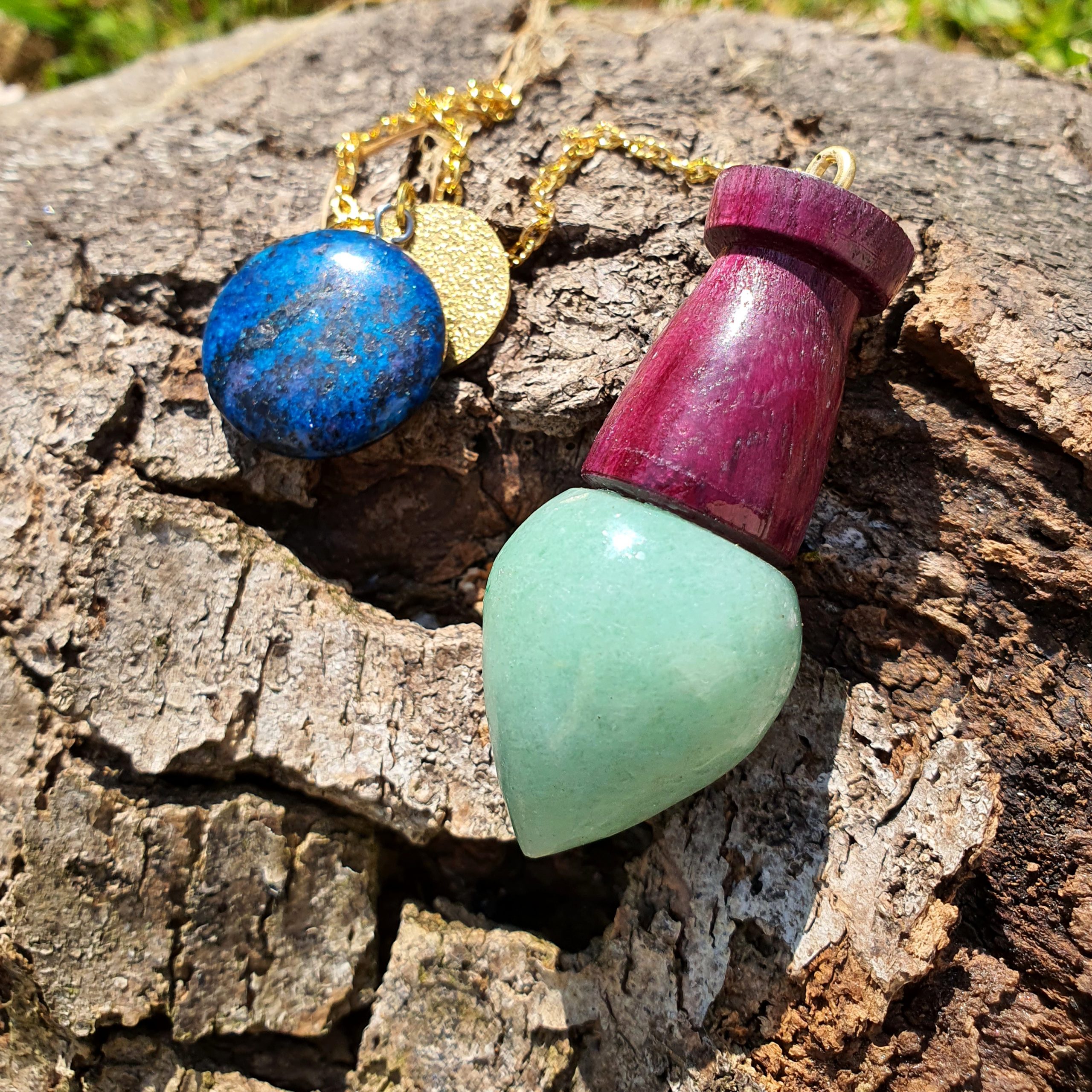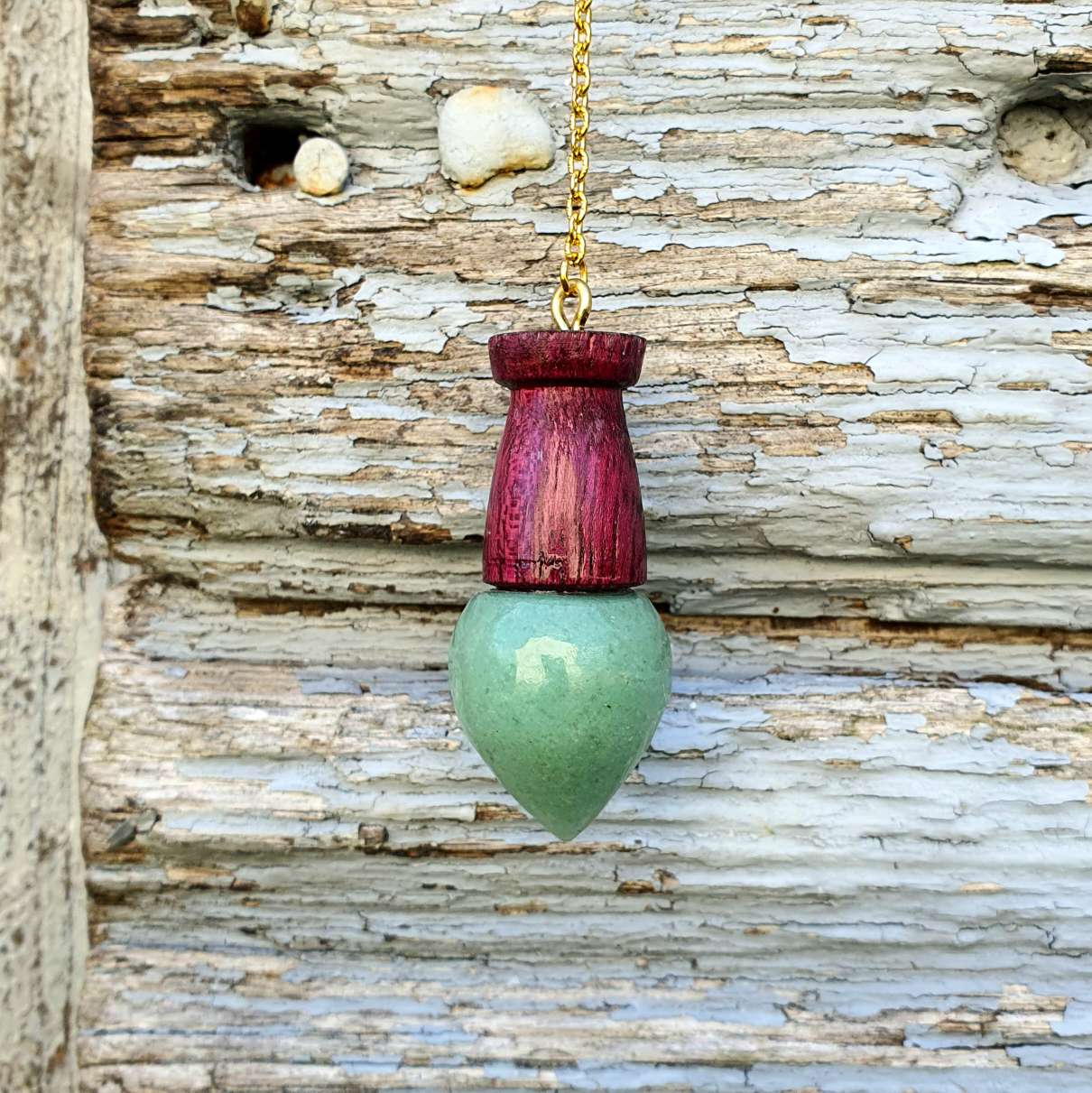 Ce pendule en pierre d’aventurine et bois d’amarante est méticuleusement conçu à la main.