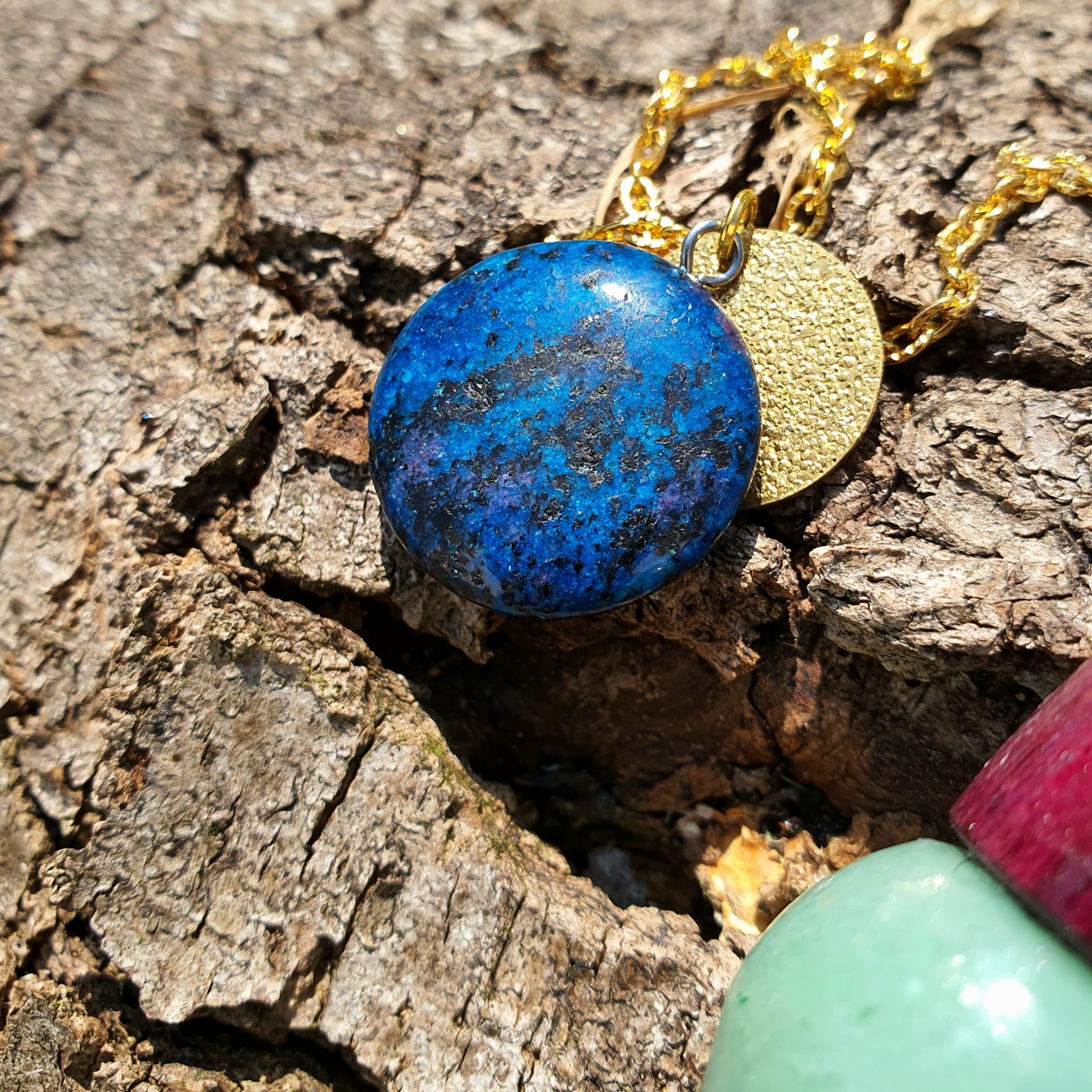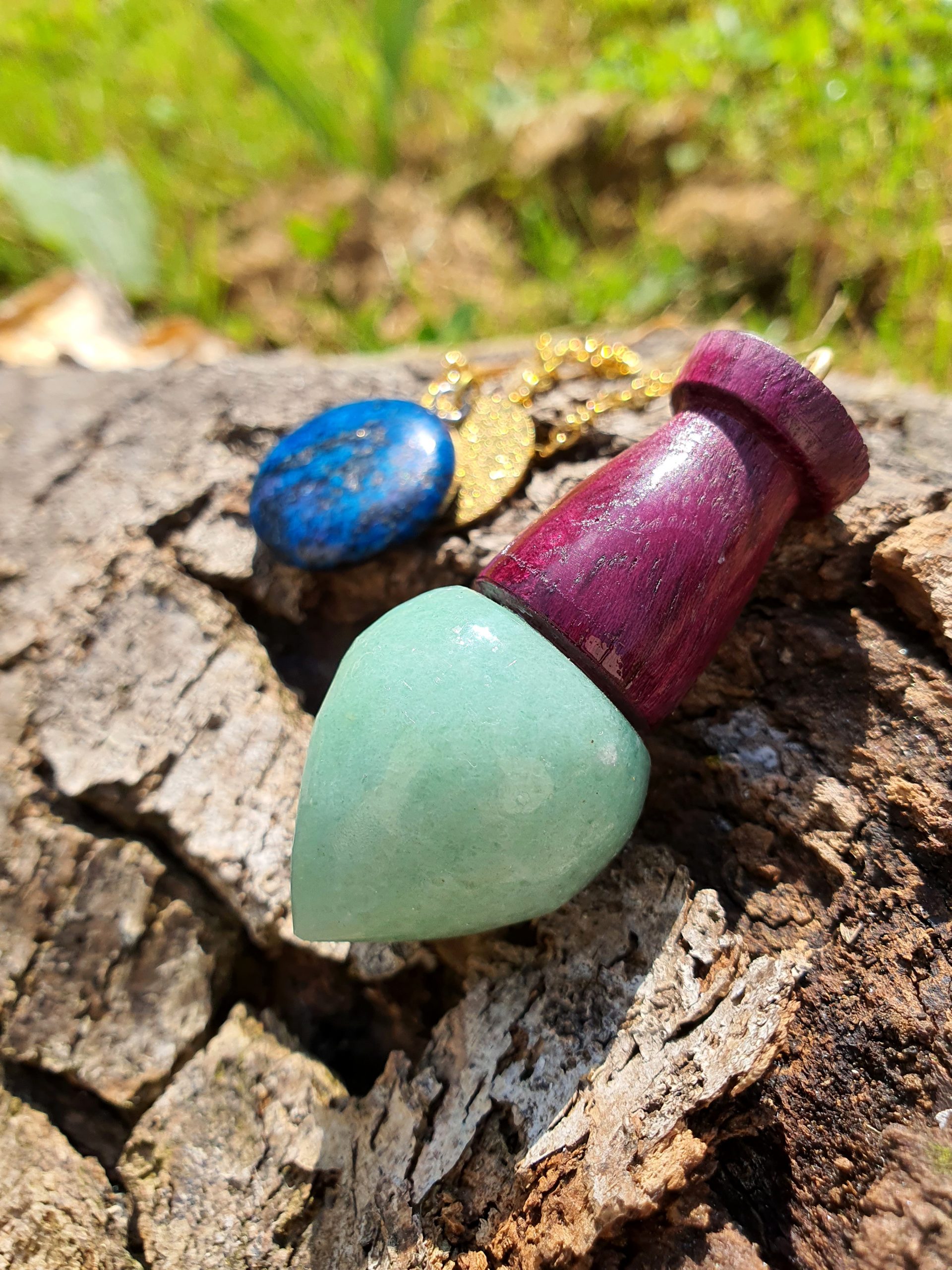 Ce pendule en pierre d’aventurine et bois d’amarante s’accompagne d’une pochette beige. Il est fabriqué à la main par mes soins à partir de bois et pierres brutes. Les matériaux naturels ont des aspérités, faisant de chaque pendule une pièce unique.