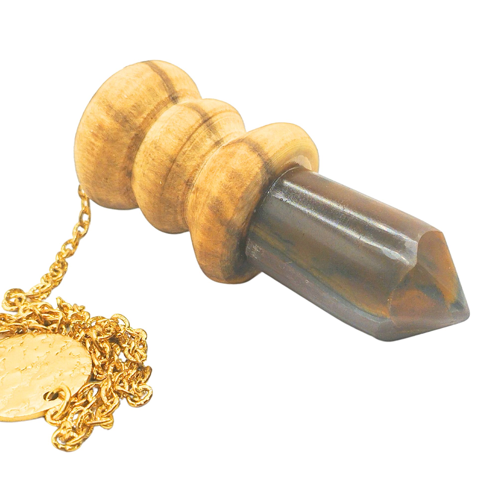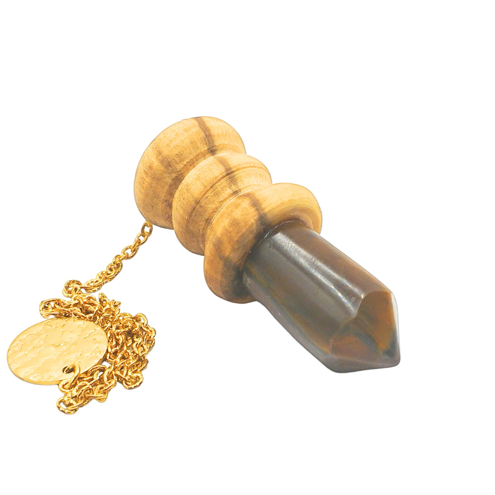 Ce pendule artisanal en bois de Houx et pierre d’Oeil de tigre est méticuleusement conçu à la main.