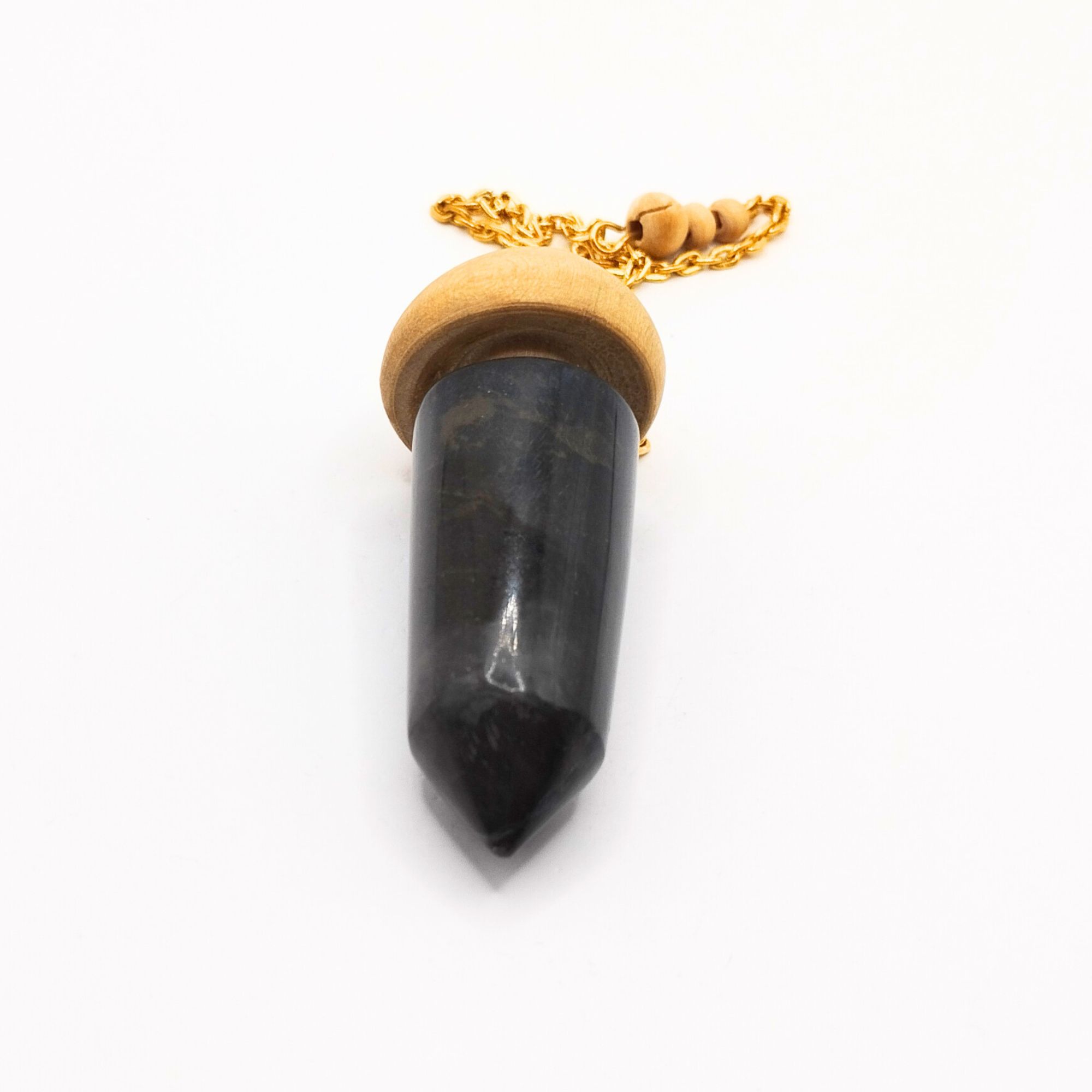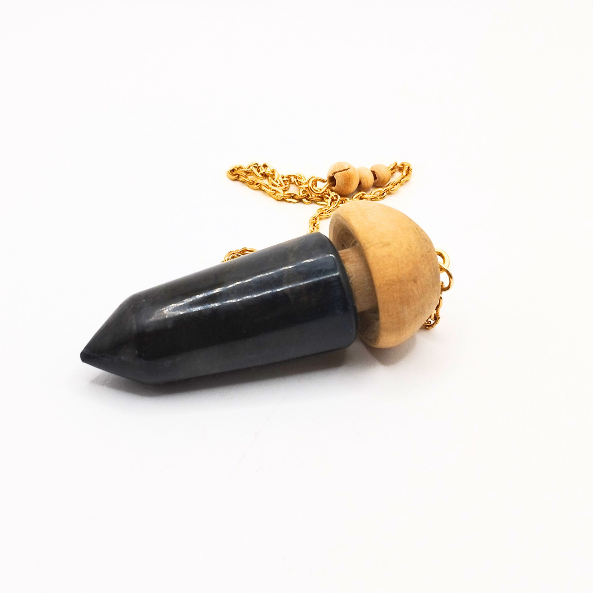 Ce pendule artisanal en bois de chêne et pierre d’Opale noire du Cantal est méticuleusement conçu à la main.