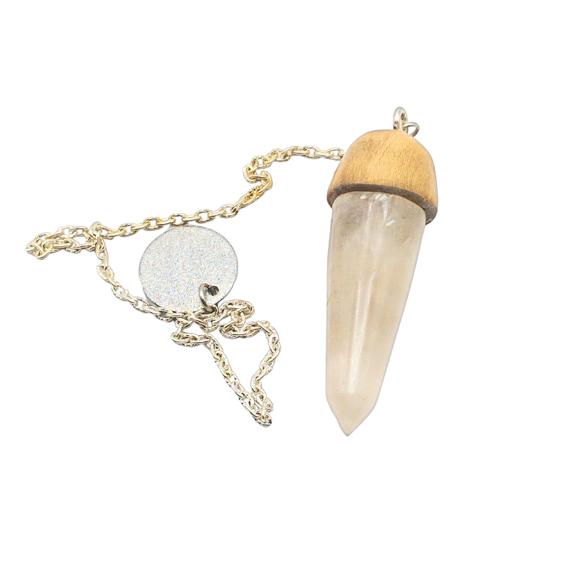 Ce pendule artisanal en bois de chêne et pierre de quartz est méticuleusement conçu à la main.
