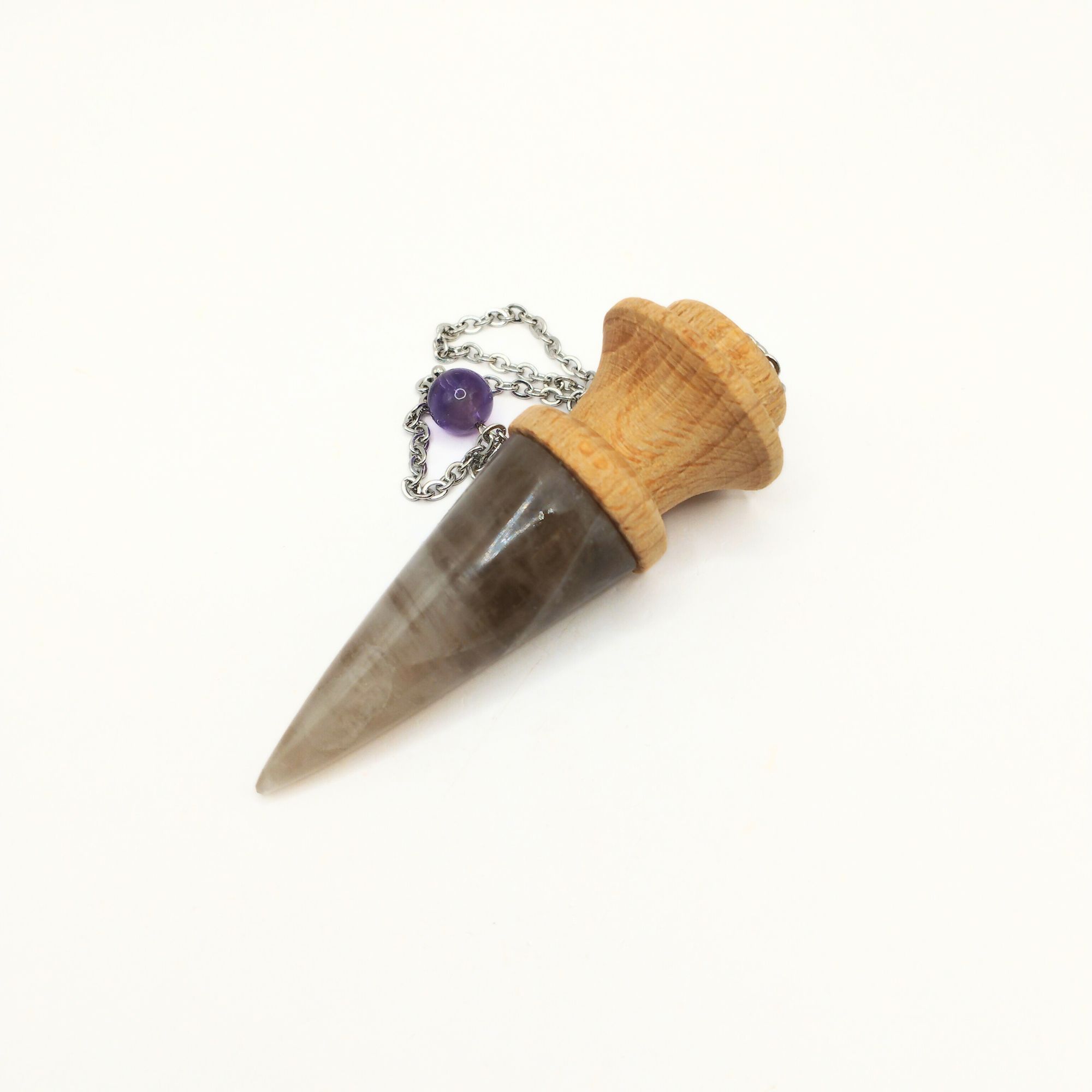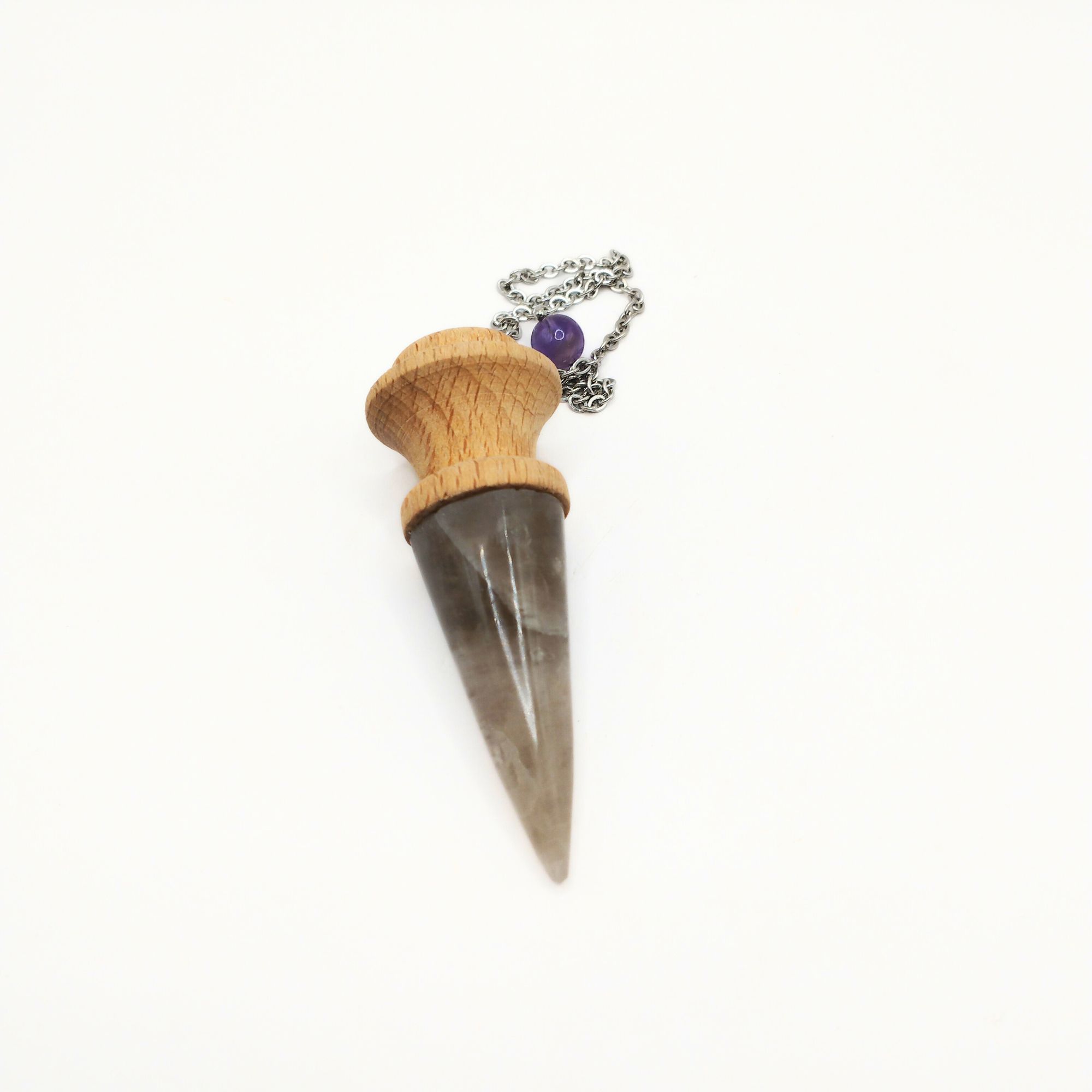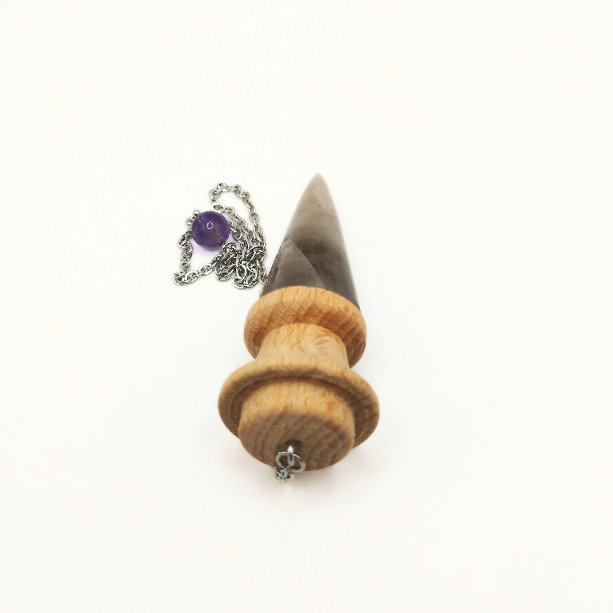 Ce pendule artisanal en bois de chêne et pierre de quartz fumé est méticuleusement conçu à la main.