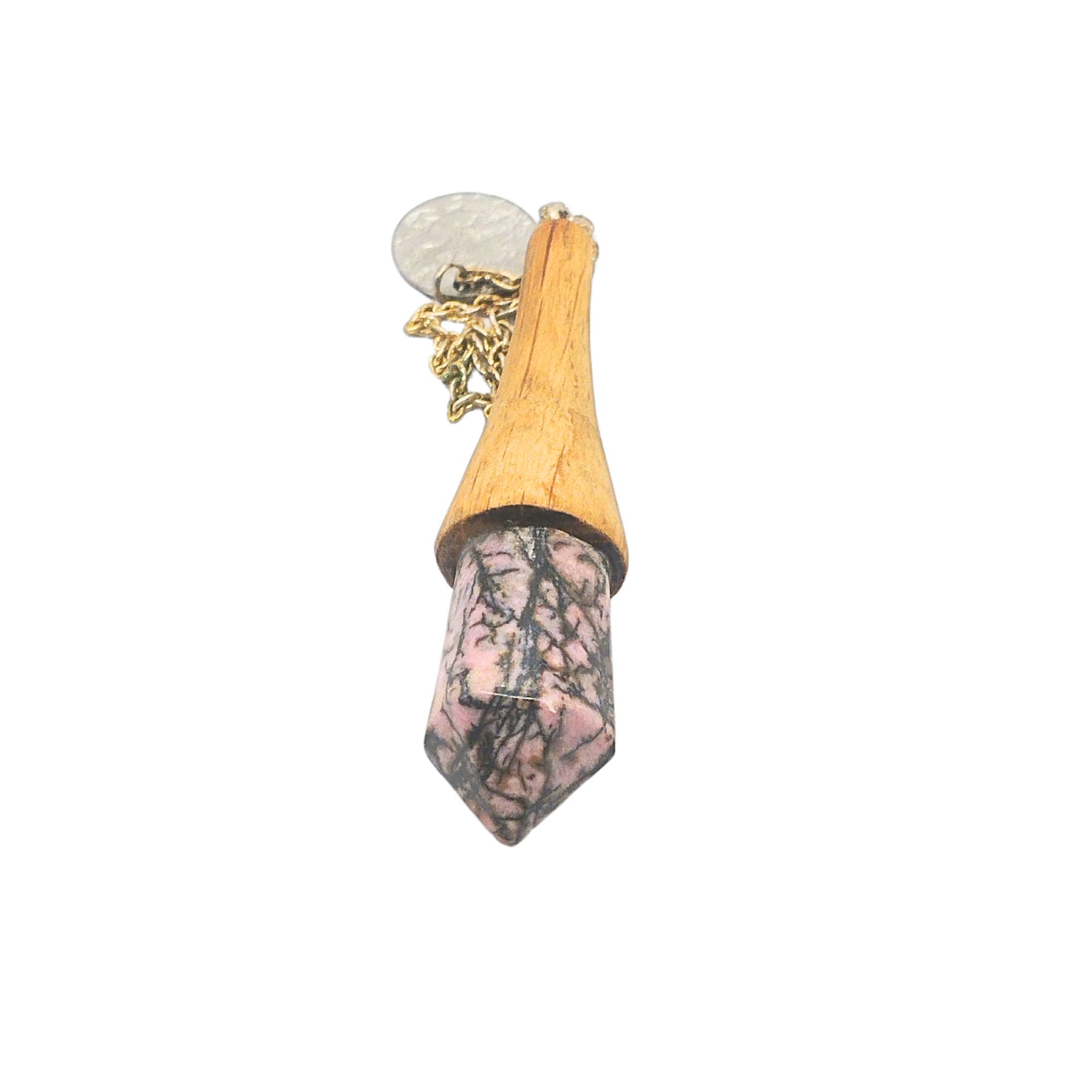 Ce pendule artisanal en bois de chêne et pierre de Rhodonite est méticuleusement conçu à la main.