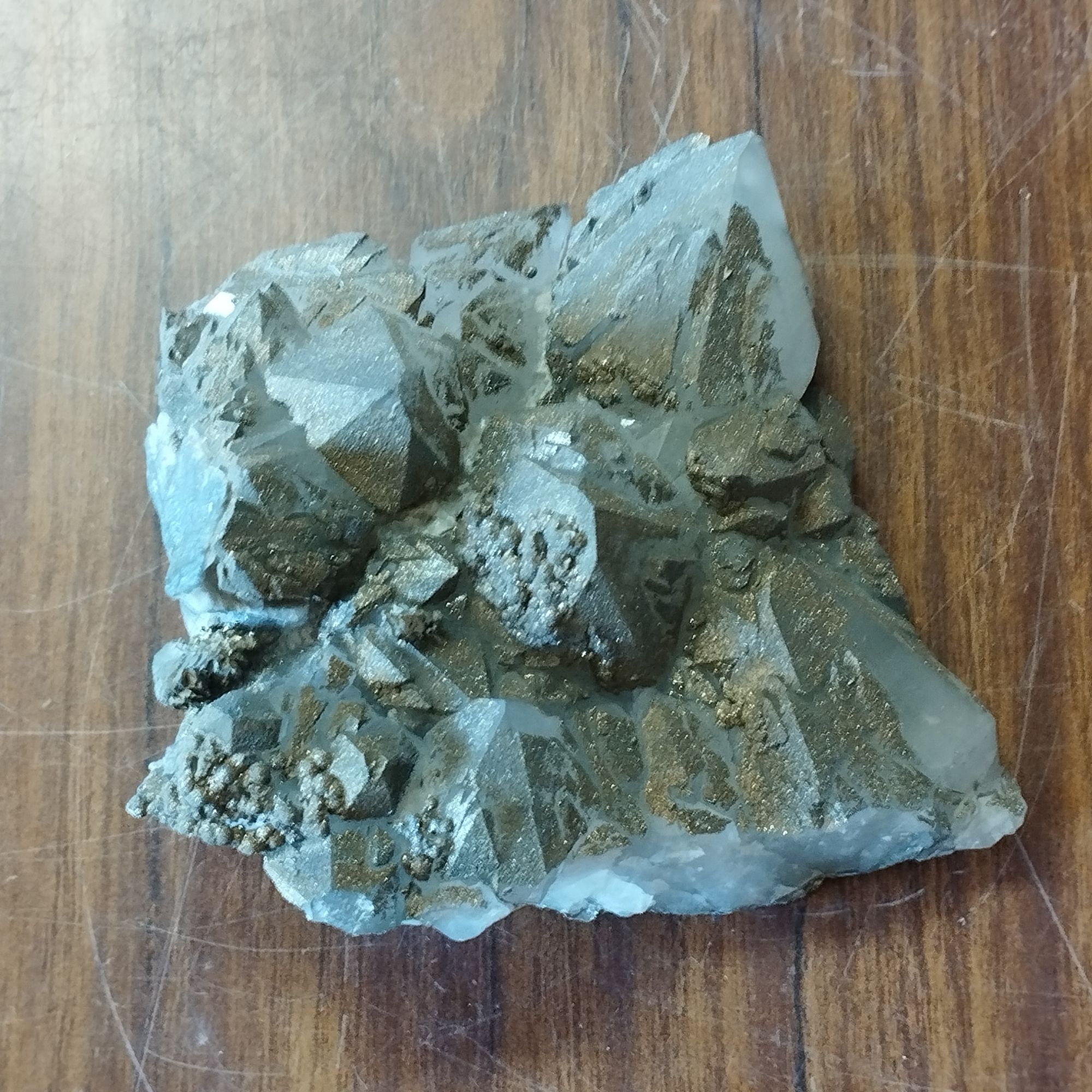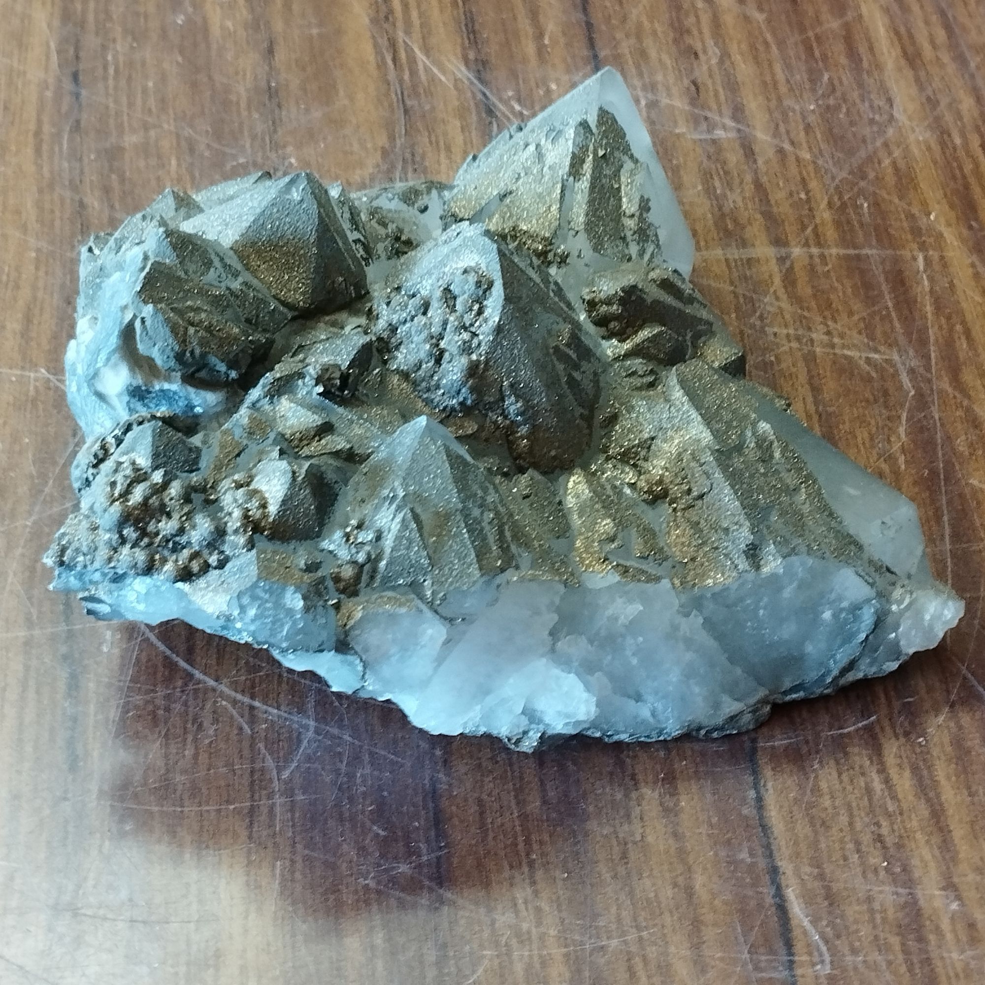 Cette Pyrite sur quartz nous vient du Maroc – 349 grammes – 85x 89x 43mm