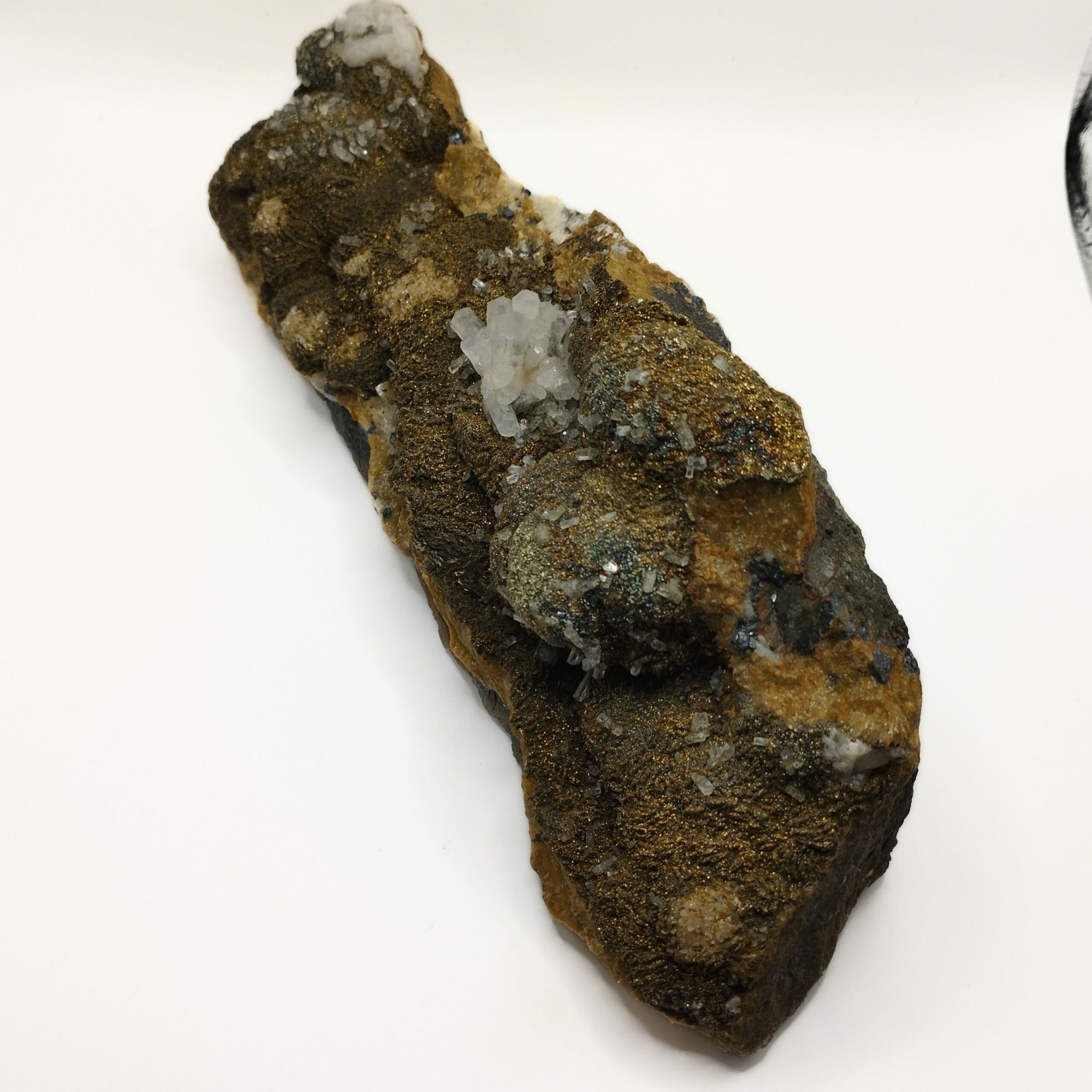 La calcite, souvent blanche ou translucide, apporte une douceur visuelle à cette combinaison. Elle équilibre l’ensemble et offre une base idéale pour la pyrite et la sidérite, créant une harmonie entre brillance et sobriété.