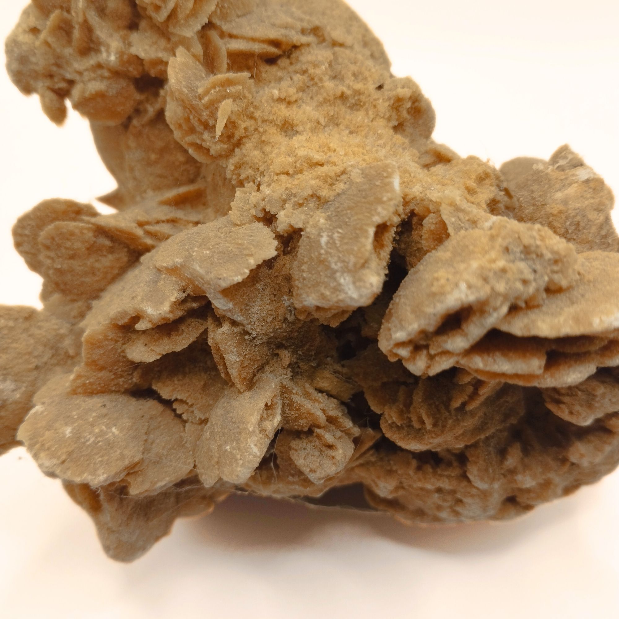 - La cristallisation se produit en couches, les cristaux formant des lames qui s’entrecroisent, capturant des grains de sable entre eux. Cela donne à la structure finale son aspect de rose avec des « pétales » en relief.