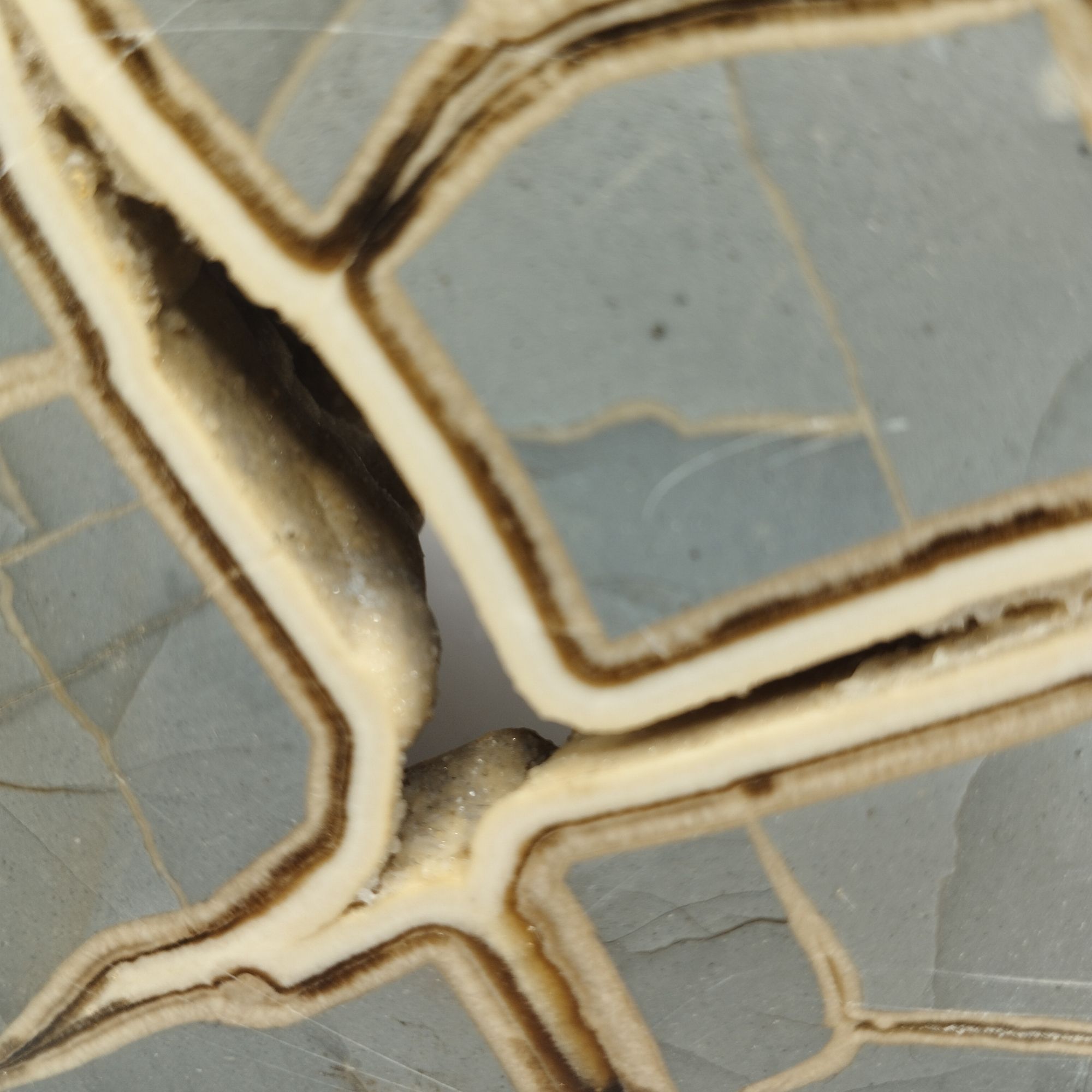 - Avec le temps, ces fissures sont infusées par des minéraux précipités par des solutions hydrothermales ou des eaux riches en minéraux. Les minéraux les plus communs qui remplissent ces fissures sont la calcite, l’aragonite, la dolomite, et parfois des minéraux argileux ou du quartz.