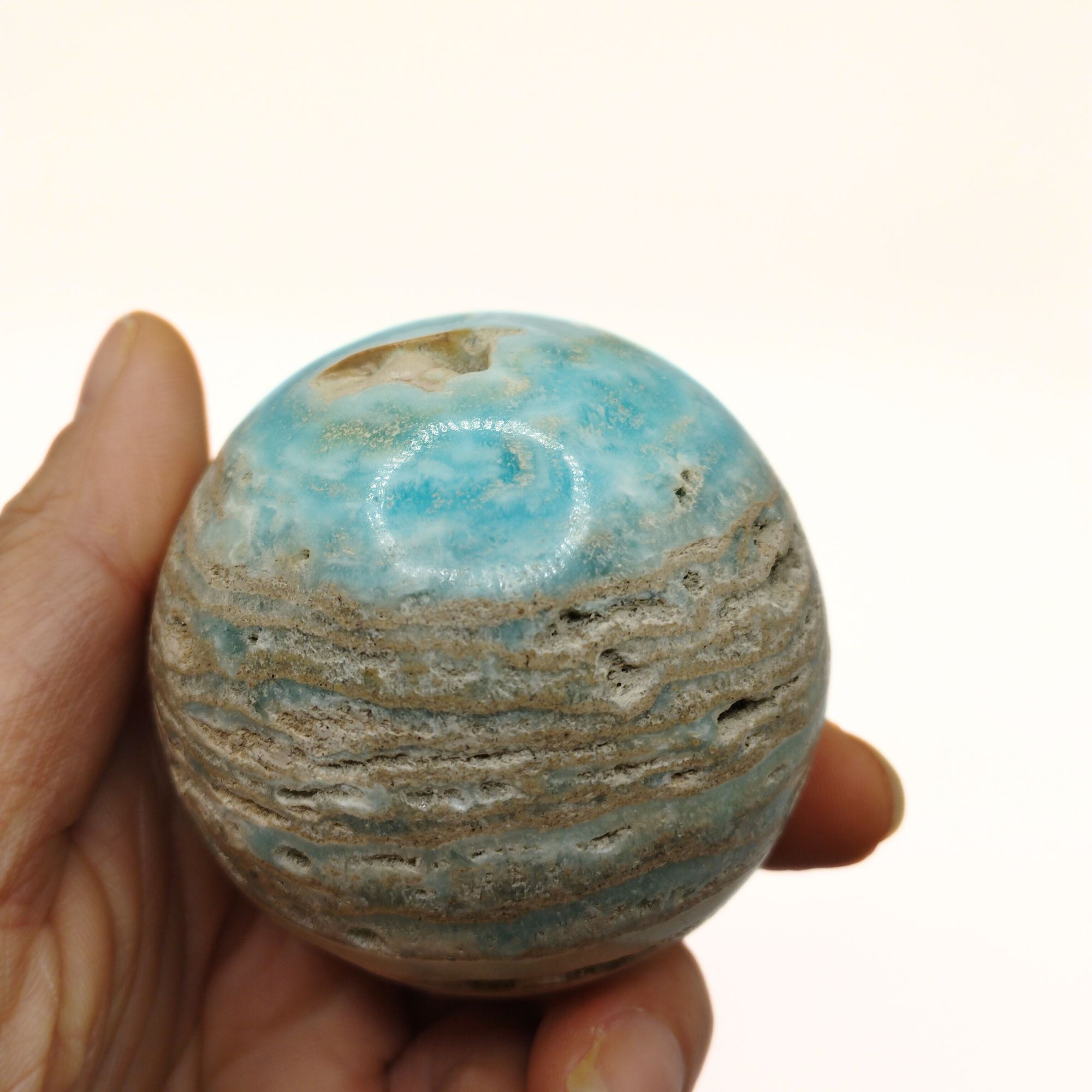 Cette sphère d’aragonite bleue avec son support nous vient du Pakistan